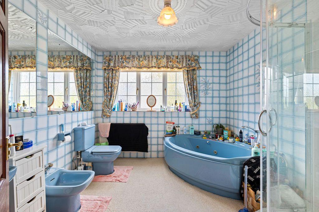 Five piece suite comprising a corner bathtub, corner shower, low level w/c, bidet and wash hand basin. Tiled walls. uPVC double glazed frosted window to side.