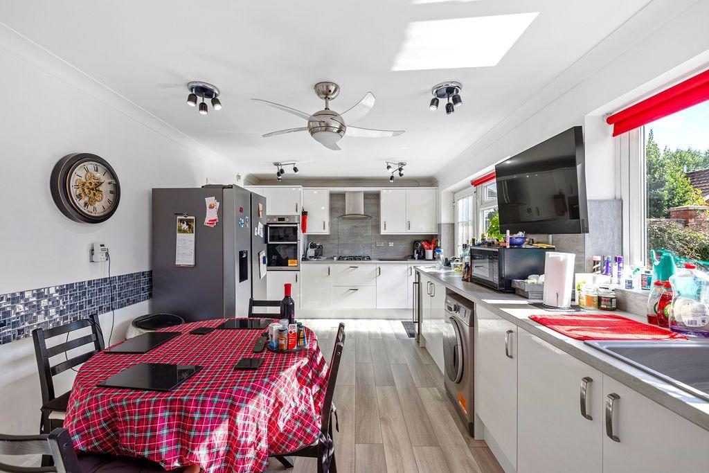 The kitchen features comprehensive fitted cabinetry including wall-mounted, base, and drawer units with coordinating worktops incorporating a one-and-a-half bowl sink with integral drainer. Kitchen appliances comprise a single electric oven with grill, four-ring Lamona gas hob with overhead extractor, and an integrated dishwasher. The space includes washing machine plumbing and accommodation for an American-style fridge/freezer. Natural light enters through two uPVC double-glazed windows overlooking the rear garden, plus a matching frosted glass door. Internal door leads to;