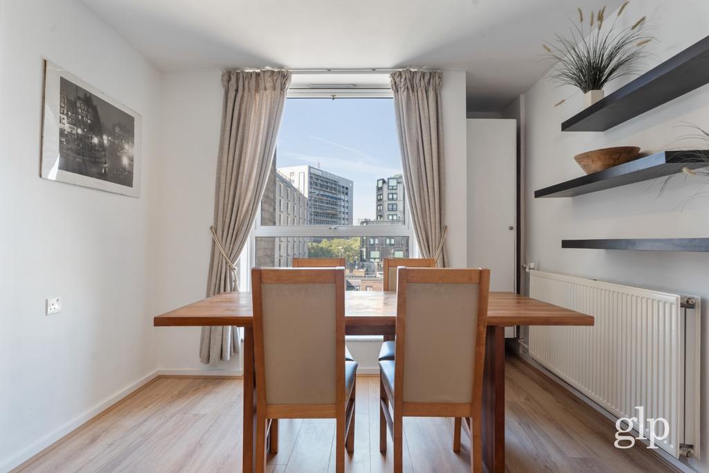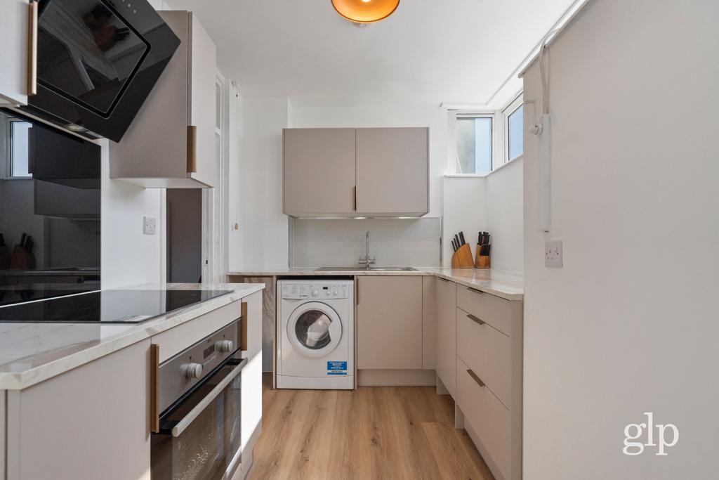 The property comprises a bright and airy living area, perfect for relaxing, entertaining, or working from home, complemented by full-height double-glazed windows that fill the space with natural light and ensure peace and quiet despite the vibrant central location. A separate modern kitchen comes fully fitted with integrated appliances and ample storage, offering a sleek and functional space for cooking.
