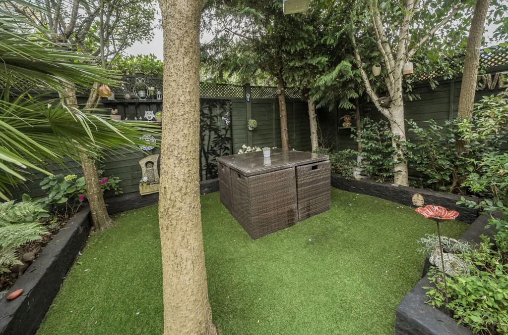 To the rear, a private well-established garden provides space for outdoor dining or relaxation. To the front, a driveway offers ample parking and access to the detached double garage.