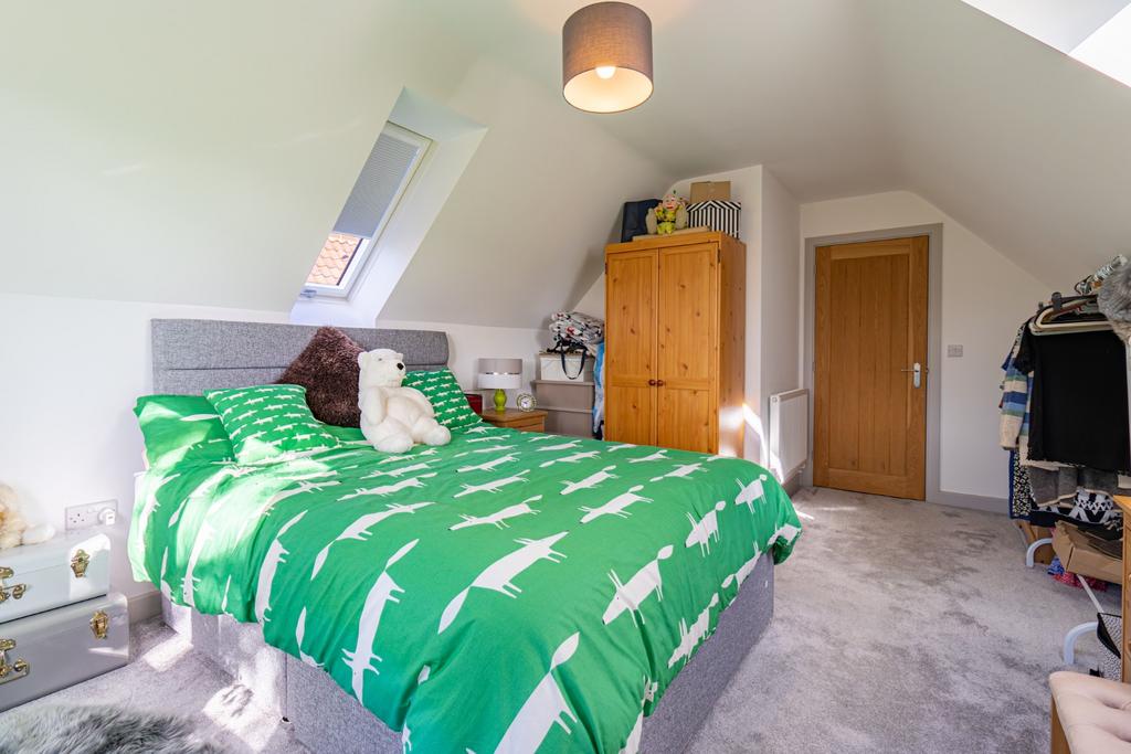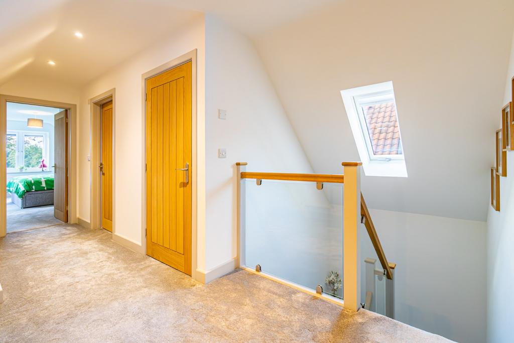 A glazed staircase with an oak handrail rises up to the first floor, where there are three bedrooms arranged around the bright and spacious landing area. Also around the landing, there is a large built-in airing cupboard and a separate linen cupboard. The master bedroom is another spacious double room with roof lights to either side, a separate dressing room and ensuite shower room. Bedrooms 2 and 3 are both double rooms which are served by a neatly appointed family bathroom.
