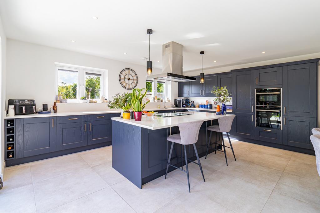 The other main reception space is the superb kitchen/dining/living space, which enjoys similarly generous proportions and also has a pair of bifolding doors leading out to the terrace. The room offers plenty of space for a dining table and other furniture alongside the high-quality fitted kitchen, which comprises an extensive collection of base and wall mounted storage units under quartz work surfaces, with a matching central island/breakfast bar. Integrated appliances include twin Neff ovens, a 5-ring induction hob, a full height fridge and freezer, and dishwasher. The adjacent utility room provides a further range of built-in storage units, as well as plumbing/space for a washing machine and tumble dryer.