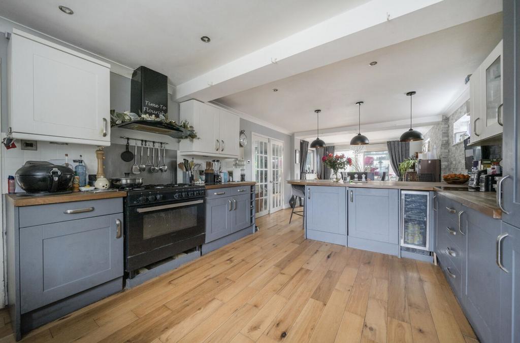 The living room is bright and versatile, with sliding patio doors opening directly to the garden for effortless indoor-outdoor living, while a feature fireplace creates a cosy focal point in the cooler months. At the heart of the home is the open-plan kitchen and dining room, finished with solid oak worktops and flooring, a breakfast bar, and space for a gas range cooker. Dual-aspect windows and doors to the garden room ensure the space is filled with natural light, complemented by a utility room and WC on the ground floor.