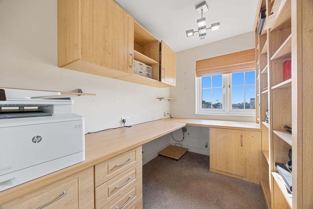 Upstairs, this home boasts five well-sized bedrooms, ensuring ample space for every family member. The master bedroom includes a private en-suite, while bedroom two also enjoys its own en-suite facilities and the additional benefit of fitted wardrobes – a real bonus for modern family life. Bedrooms three and four are generous doubles, while bedroom five is perfect for those working from home, offering built-in bespoke furniture and a ready-made study setup. A family bathroom completes the upper floor, all showers are mains pressured, providing excellent water flow throughout the home.