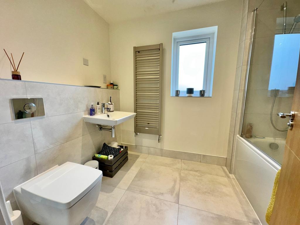 A good size modern white suite comprising a panelled bath in full tiled surround with mixer bath tap and built-in shower with glass screen. Enclosed flush wall hung low level WC. Wall hung wash hand basin with mixer tap in tiled splash back. Tiled flooring. Runged radiator. Triple glazed opaque window. Downlighters. Tiled floor.