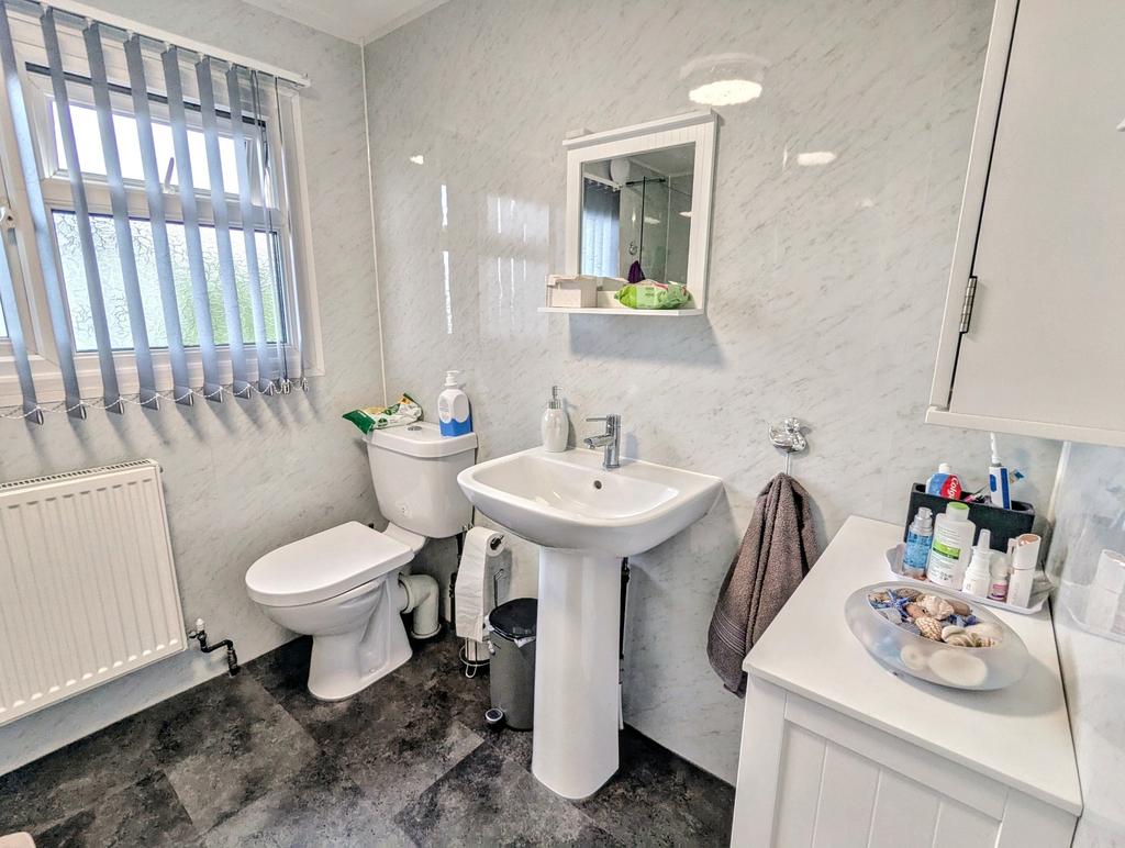 Newly fitted shower room with UPVC obscured double-glazed window, single radiator, WC, pedestal sink, large electric shower with glass panels, base and wall storage units, and vinyl flooring.