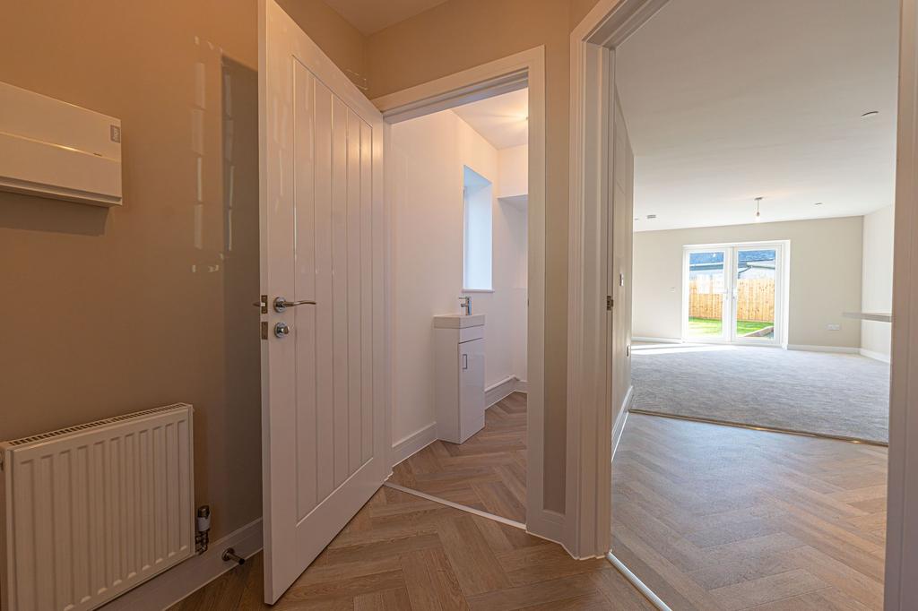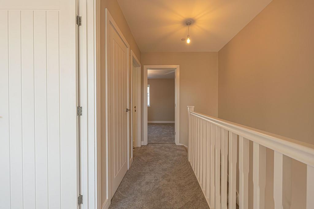 To the first floor we have the three bedrooms, two of which are double in size while the third is a comfortable single, which could also work well as a home office or dressing room. The principal suite is positioned at the front of the house, with a considerable size and multiple windows to offer a great amount of natural light. From the hallway we can find a helpful airing/storage cupboard, as well as the sleek family bathroom, equipped with a bath suite and rainfall shower.