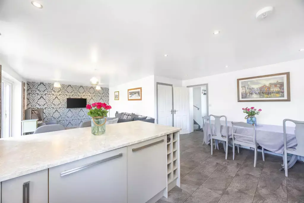 The heart of the home is a stunning open plan dining kitchen and living space, complete with a stylish contemporary kitchen featuring a breakfast bar and bi-folding doors opening to the garden and patio areas – an ideal space for modern family living and entertaining.
