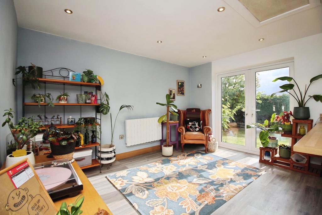 The kitchen has been refurbished and is now fitted with a modern range of wall and base units, including soft-close drawers, an inset sink and drainer with a boiling water tap, built-in oven, hob with extractor hood, and an integrated fridge freezer. The space allows for a family-sized dining area, while French doors open directly onto the rear garden, making it ideal for both everyday living and entertaining.