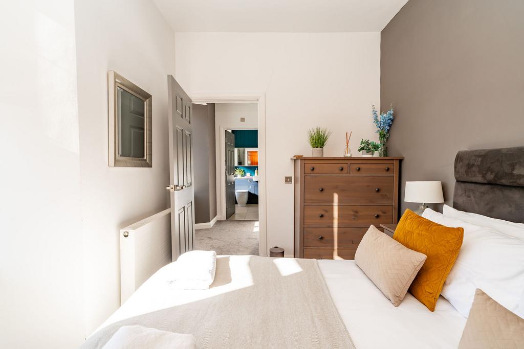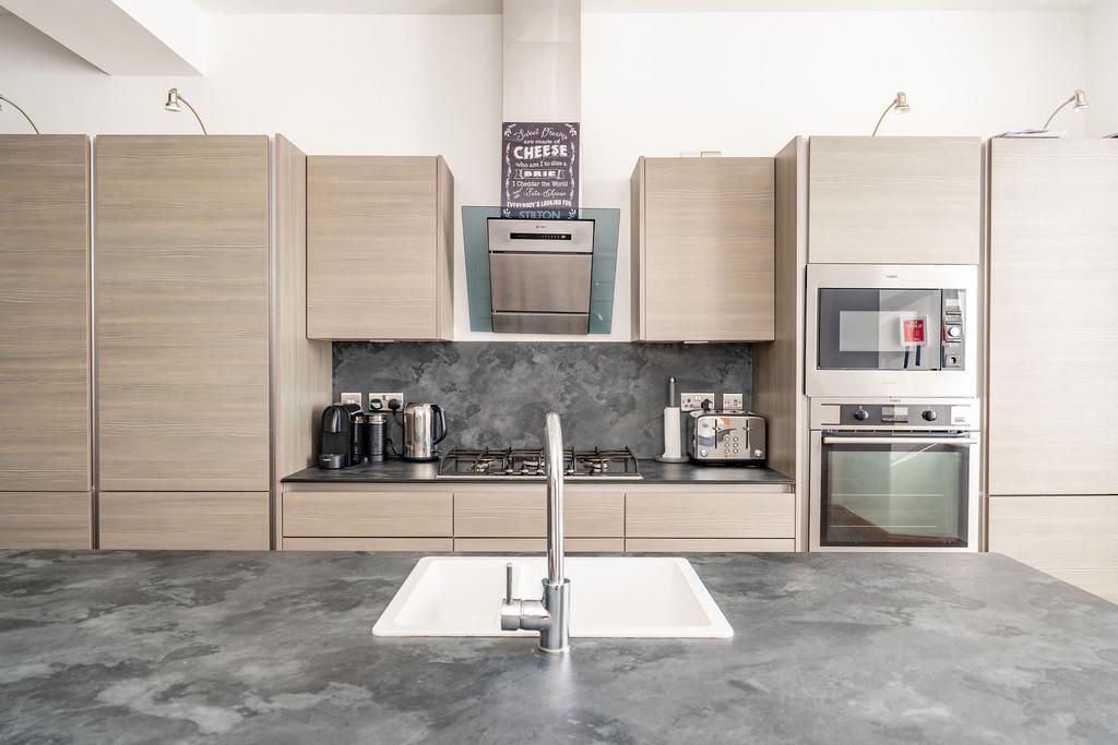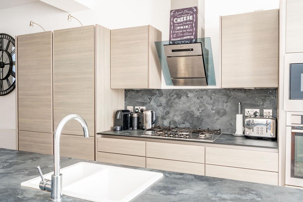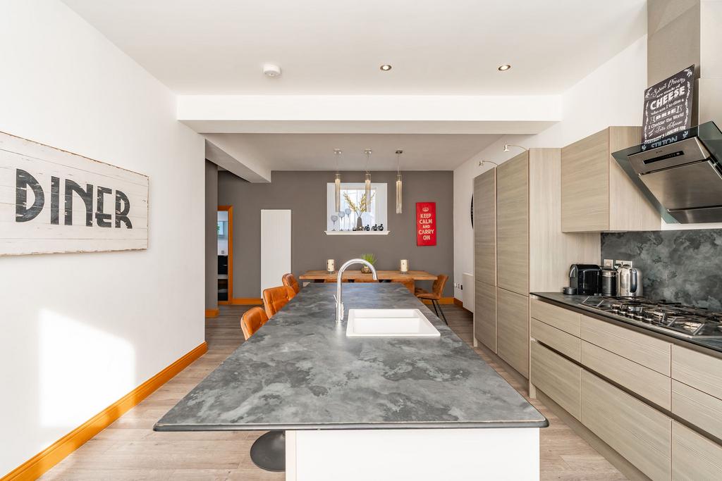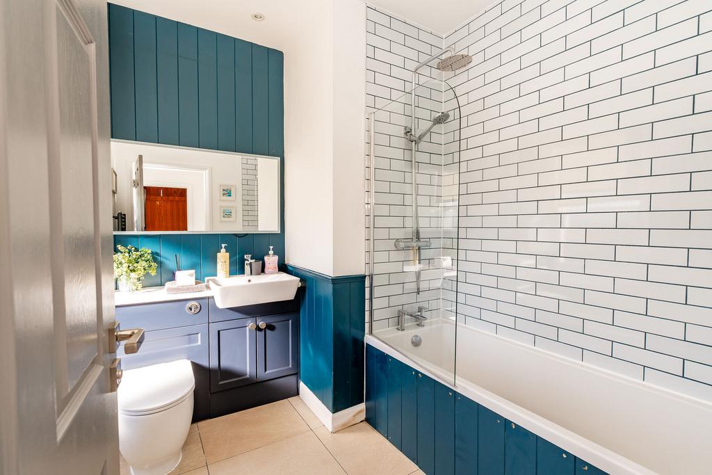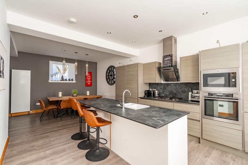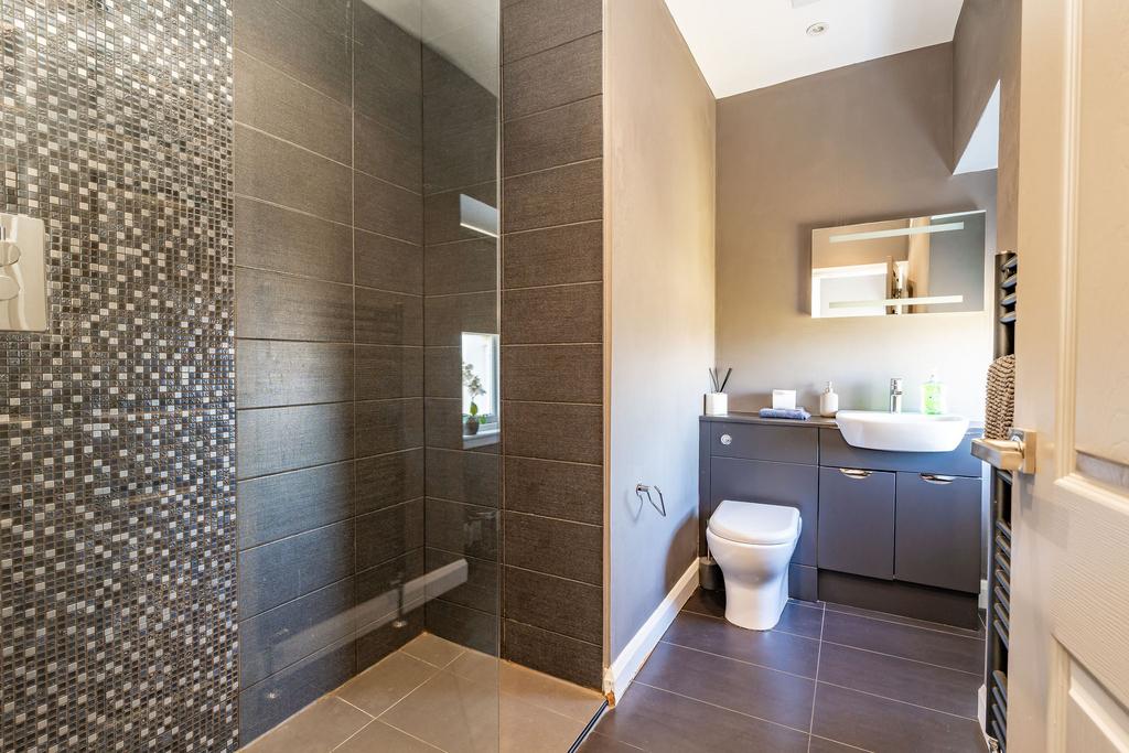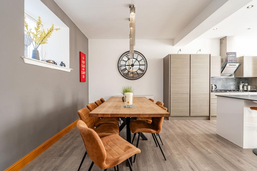 The front door opens into an entrance foyer that in turn leads into a bright and spacious south and west-facing living room opening to the rear garden. Boasting a tasteful decor including handsome wooden flooring and an elegant colour palette, it exudes a sense of modern sophistication and comfort. From here, a seamless U-shaped flow ushers you into an impressive and light-filled dual-aspect dining kitchen, thoughtfully designed to offer a stylish retreat for day-to-day living and entertaining. Contemporary and stylish, the kitchen boasts a striking central island with seating for three, while the streamlined one-wall layout is fitted with gloss handleless cabinetry in a natural hue, offset by illuminated slate-effect black worktops and coordinating splashbacks. High-spec integrated appliances include a five-ring gas hob, a slanted extractor hood, microwave, and oven. A convenient guest WC completes the ground floor. Upstairs, four generous and well-appointed double bedrooms await, each enjoying plentiful natural light and two with built-in wardrobes. The west-facing principal bedroom is a standout, adorned with plush carpeting, a serene colour scheme, a dedicated dressing area, and a luxurious en-suite shower room. With a rainfall shower, hidden cistern WC, washbasin built into vanity, and chrome towel radiator, the space has a refined, spa-like ambience. The chic family bathroom mirrors this style, featuring soft blue accents, metro tiling, a hidden cistern WC, washbasin built into vanity, and a bath with a wall-mounted rainfall shower.