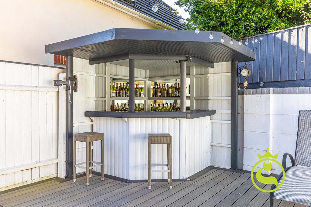 Stepping outside, the property features a landscaped-low maintenance garden, perfect for enjoying summer evenings gatherings. The garden also includes a well-appointed bar area, ideal for entertaining guests or relaxing after a long day.