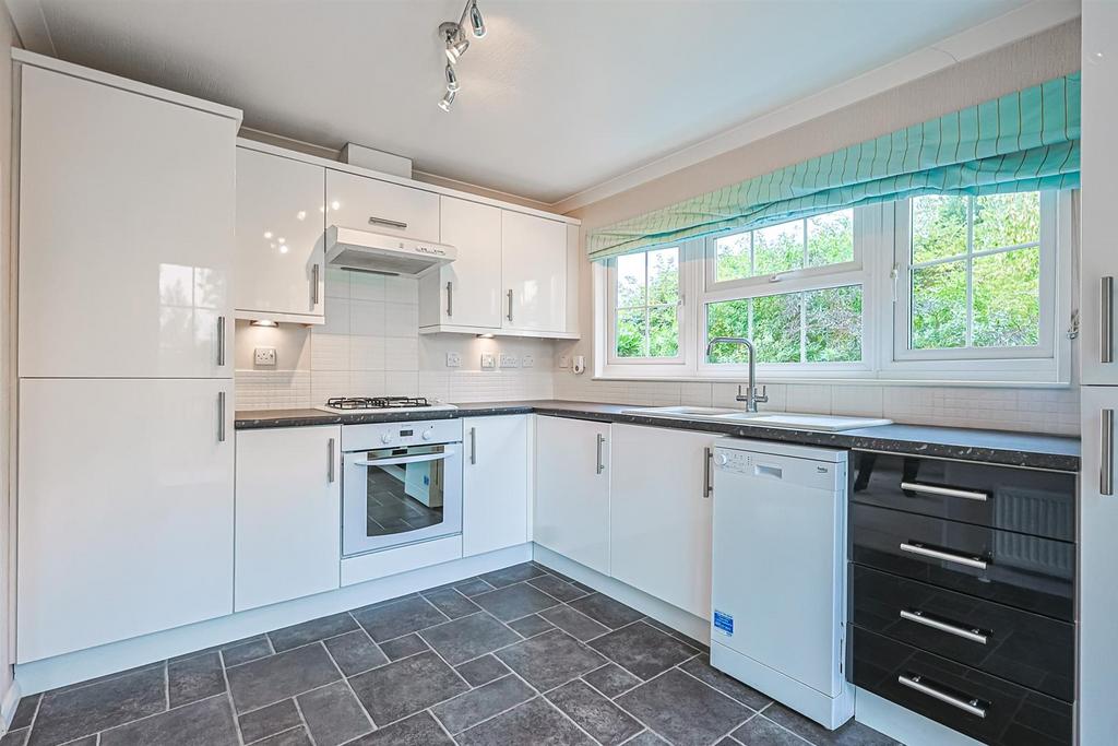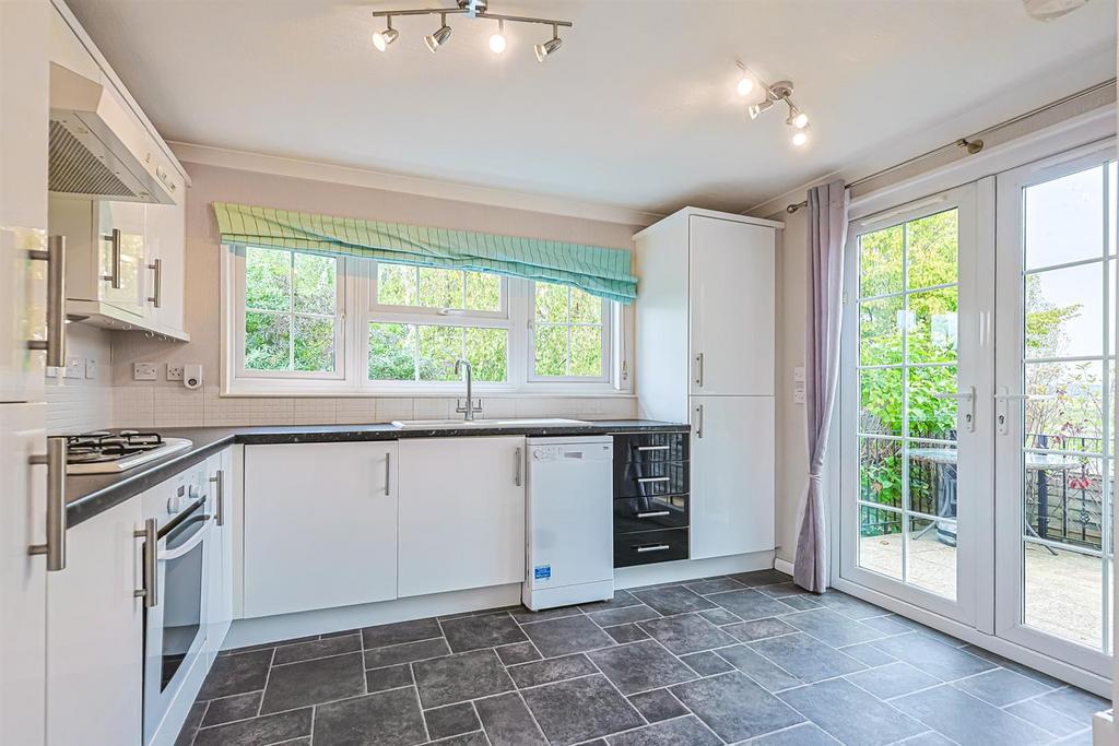 Kitchen - 3.53m x 2.87m (11'7 x 9'5 ) - Double glazed French doors to the decking area, double glazed window to the side, pendant ceiling lights, eye and base level units, wash hand basin with draining board, tiled splashbacks, integrated fridge freezer, gas hob with extractor fan above, power points and tiled flooring throughout.