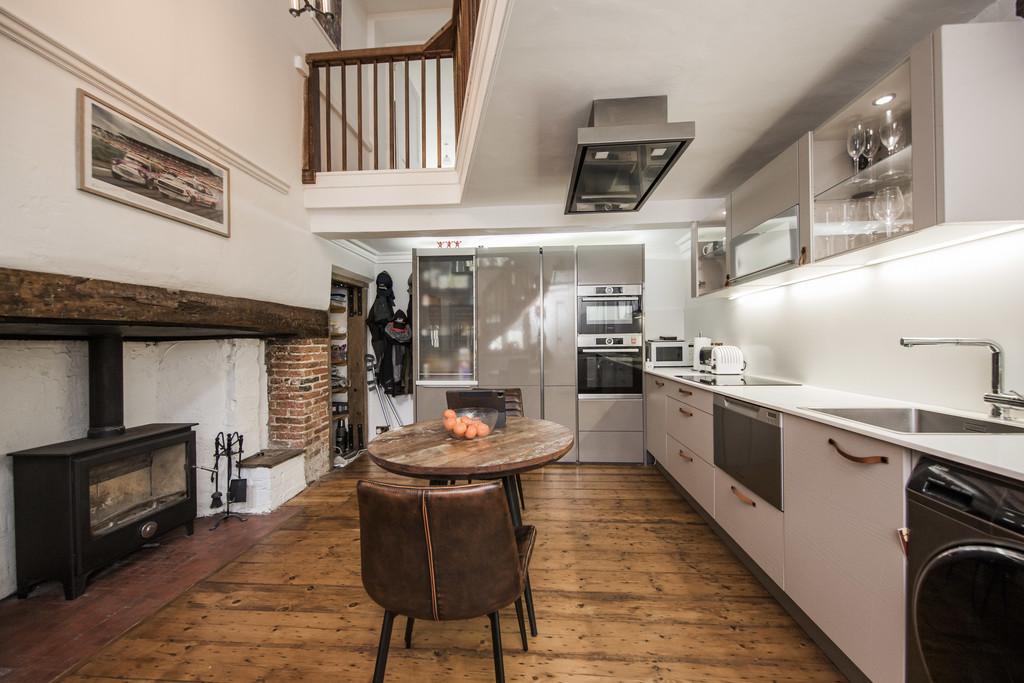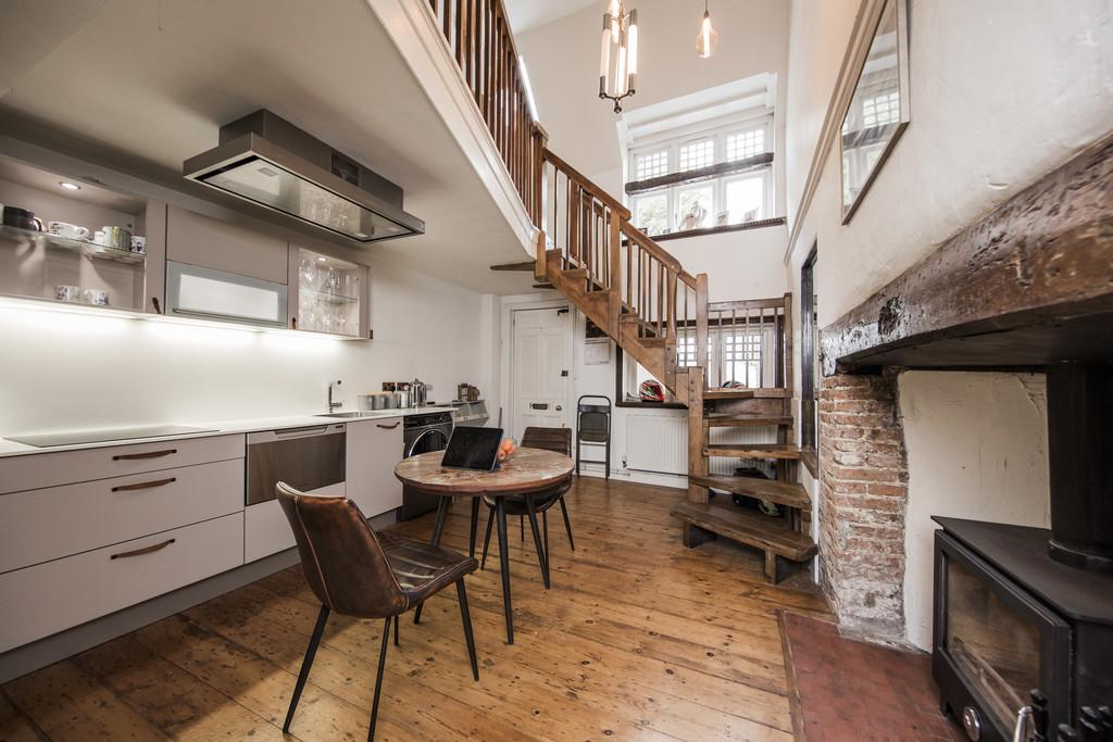 KITCHEN/DINING ROOM: Range of high and low level cabinets with under unit lighting and a worktop over incorporating a stainless steel sink. Appliances include a double oven, electric induction hob, ceiling mounted extractor fan, fridge/freezer, integrated dishwasher and a washing machine. In addition is space for dining table and chairs, a fireplace housing a wood burner with brick surround and wooden mantle, wood flooring, radiator and stairs to galleried landing above.