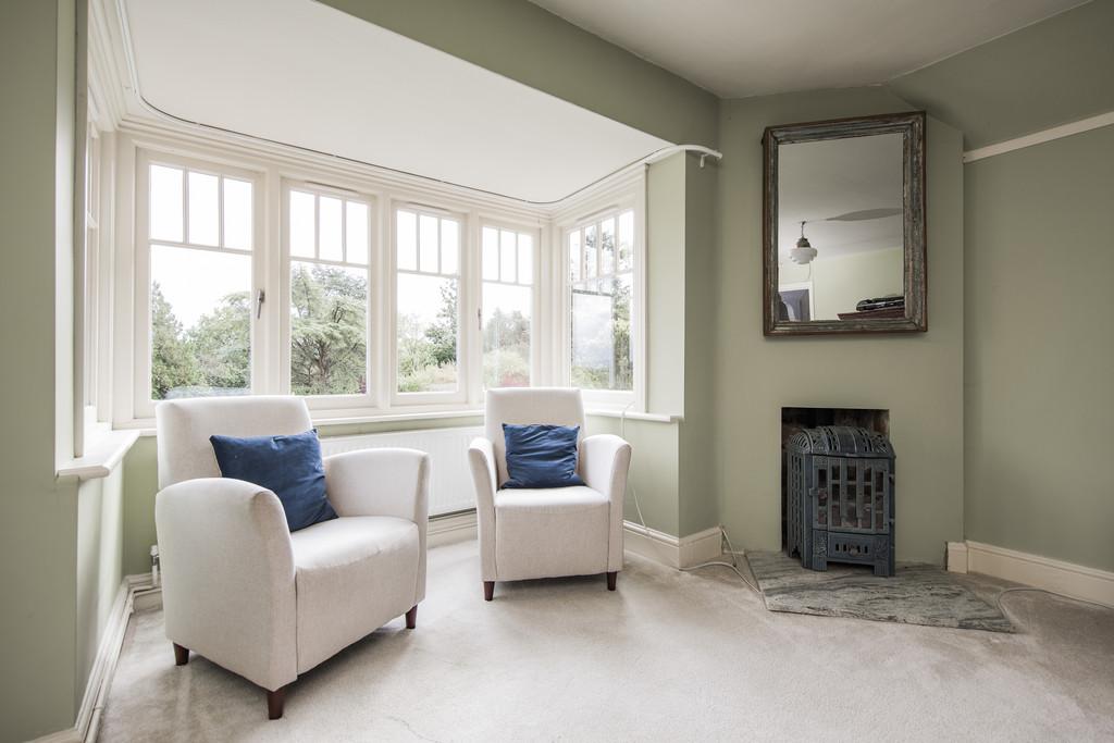 SITTING ROOM: Corner ornamental fireplace, radiator and square bay window with with views to the rear.