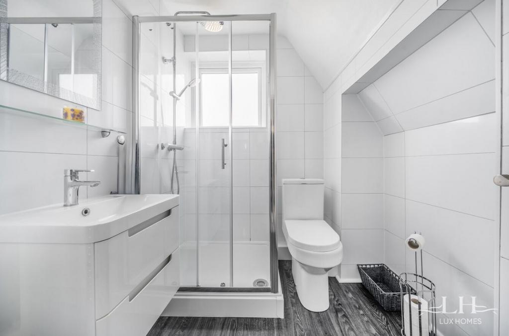 Going up the stairs, we have three good sized bedrooms. Decorated in a clean white and grey theme, they are very modern. Continuing on this floor, we also have a family bathroom where the modern theme flows through.