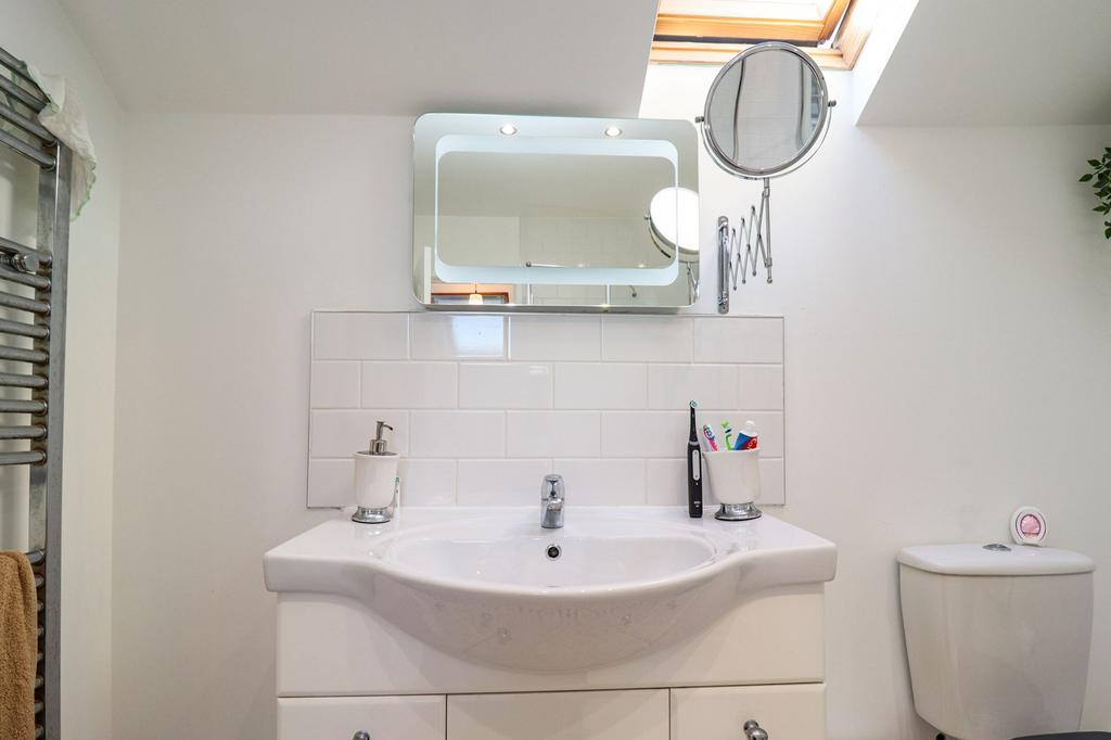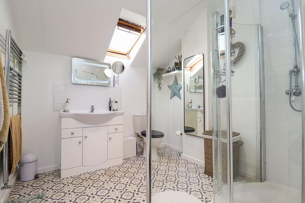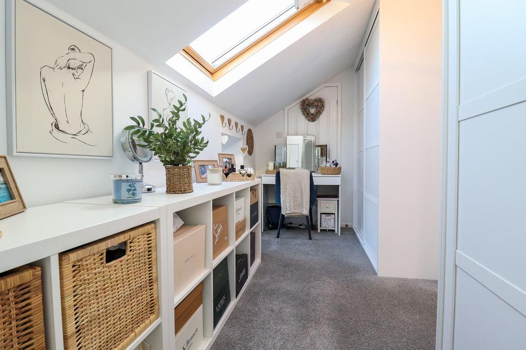 The first floor is dedicated to the impressive primary bedroom, which boasts a modern en-suite bathroom, walk-in wardrobe, skylight windows, and generous eaves storage. On the landing, there is also a convenient office space, perfect for working from home or study use.