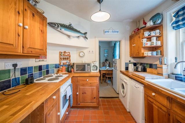 Terracotta floor tiles, timber fitted units with oven, washing machine and dishwasher. Doors to the garden and: -