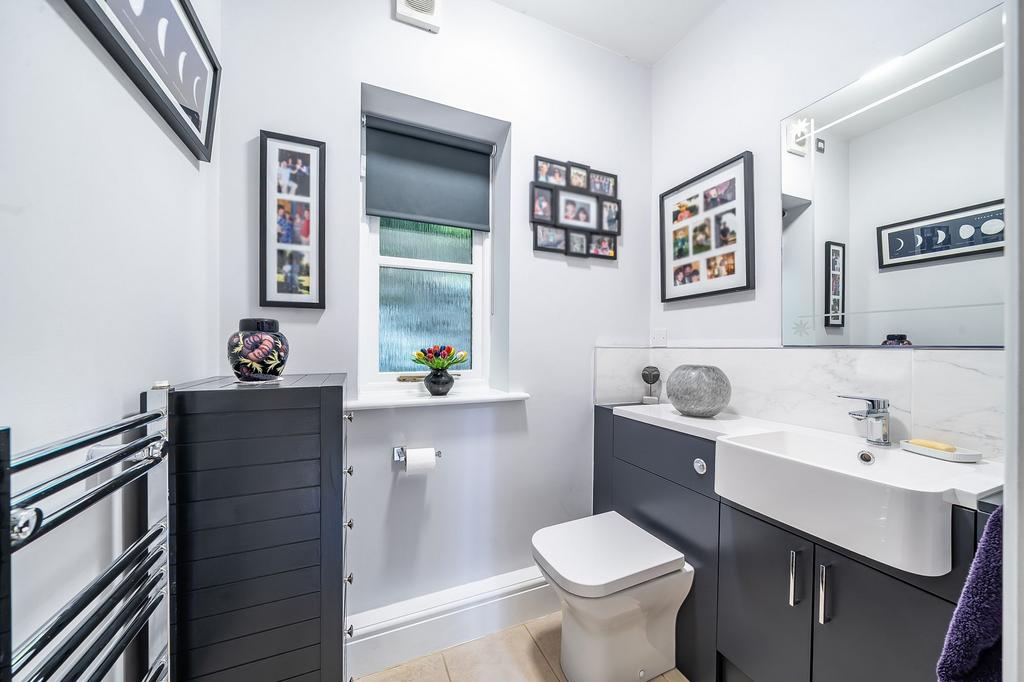 The property is approached via a private, low-maintenance front garden with gated access. Inside, the ground floor features a stylish open-plan kitchen and dining area with ample fitted storage and workspace, complemented by double doors leading to the outdoors. From the hallway, you’ll also find a modern WC and a beautifully presented reception room, complete with further double-door access to the garden.