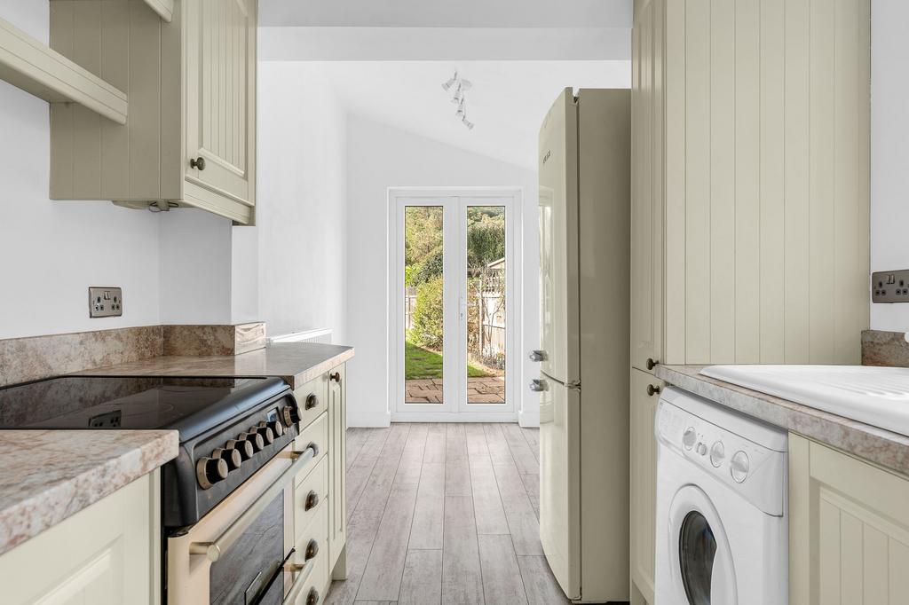 With double window to side aspect and double glazed double French patio doors to the rear garden. Fitted with a range of wall and base storages units with work surfaces over incorporating a sink and drainer unit, appliance space, wood effect flooring, radiator.