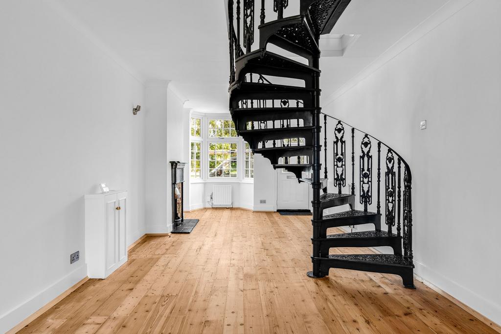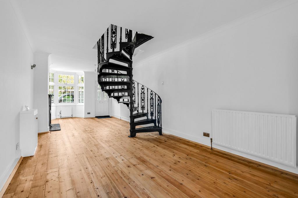 With double glazed bay window to front aspect and sash style window to rear aspect, attractive cast iron fireplace, wood flooring, spiral staircase to first floor landing, three radiators, meter cupboard, door to: