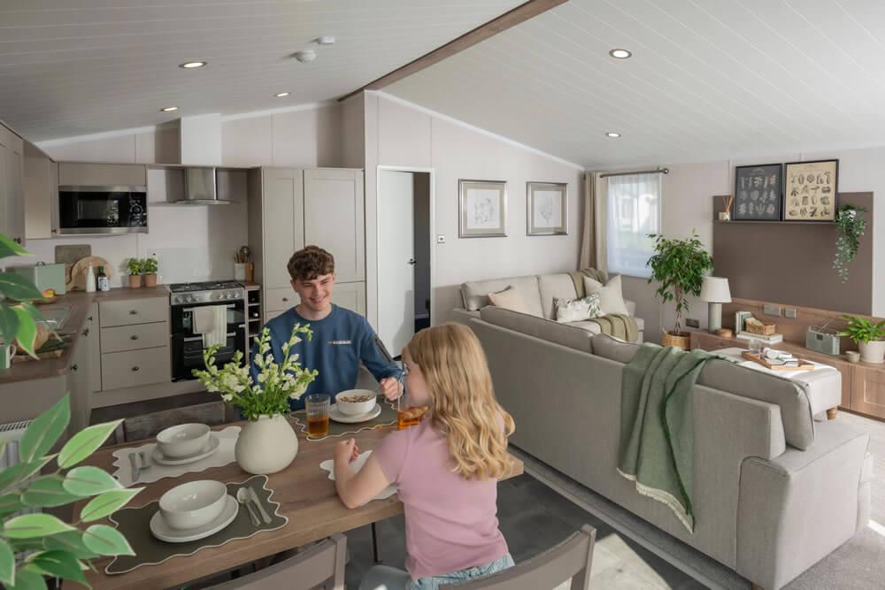 The 2025 Swift Montreal Lodge is a luxurious twin-unit holiday home designed with families in mind. It blends a farmhouse aesthetic with modern comforts.