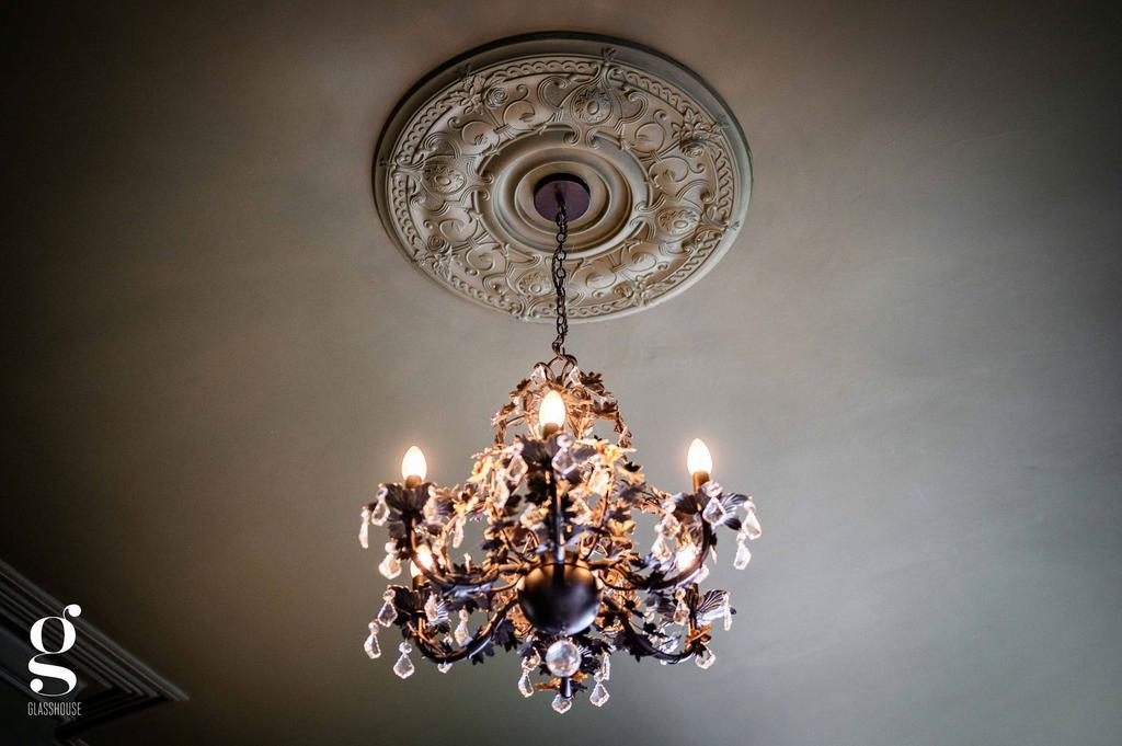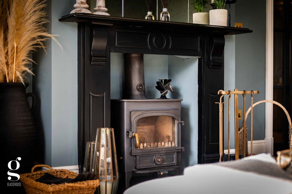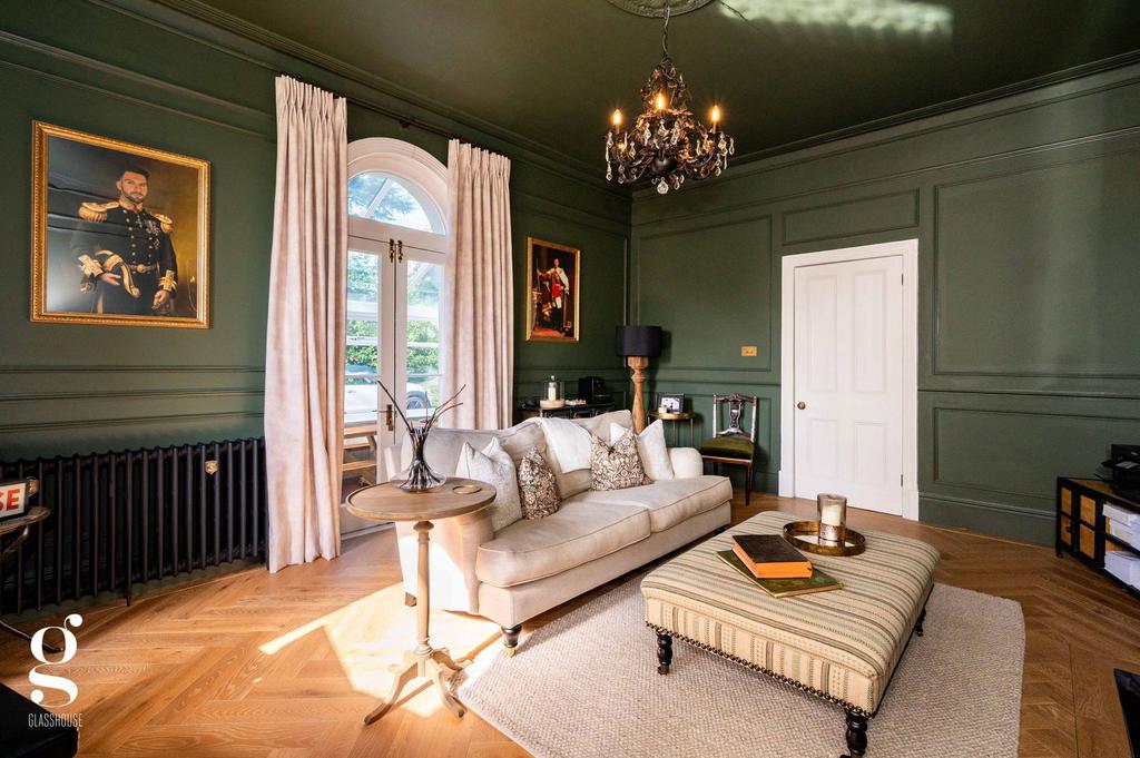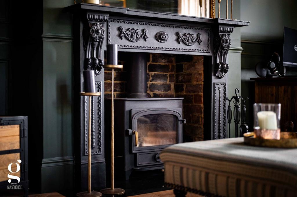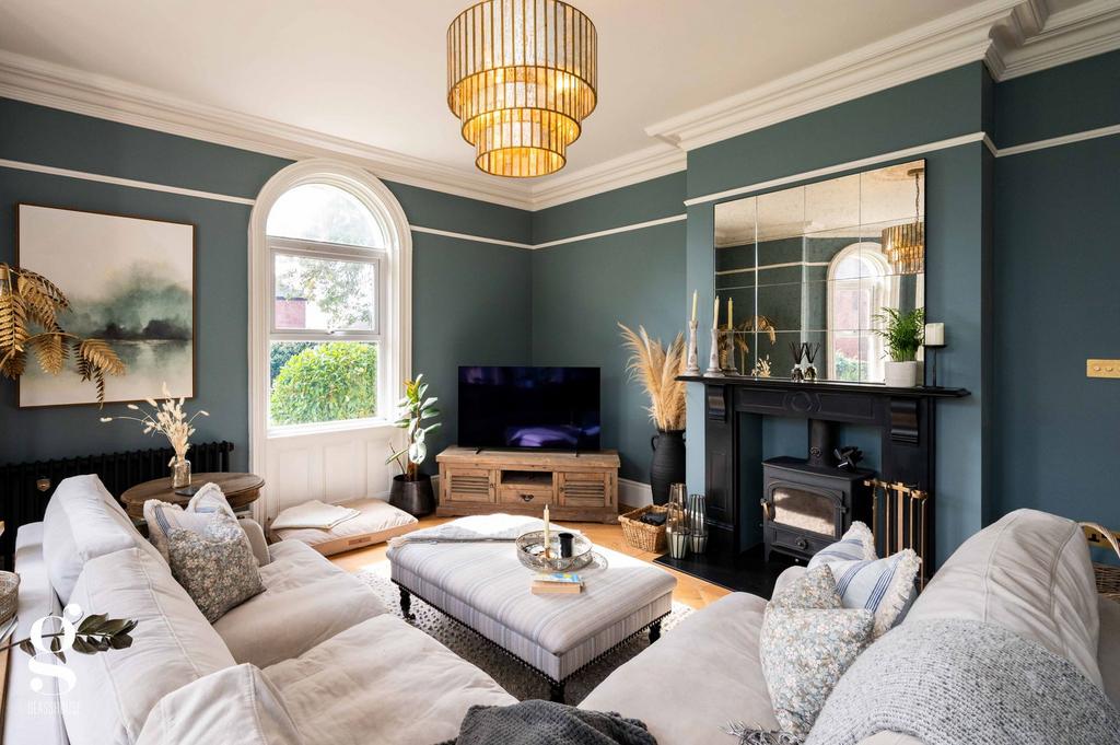 Drawing Room: An imposing reception room with Victorian cornicing and ceiling roses, central fireplace fitted with a woodburning stove, and sash windows with curved arches set within the bay window, overlooking the gardens. Re-skimmed walls and brass-finished sockets add period authenticity.