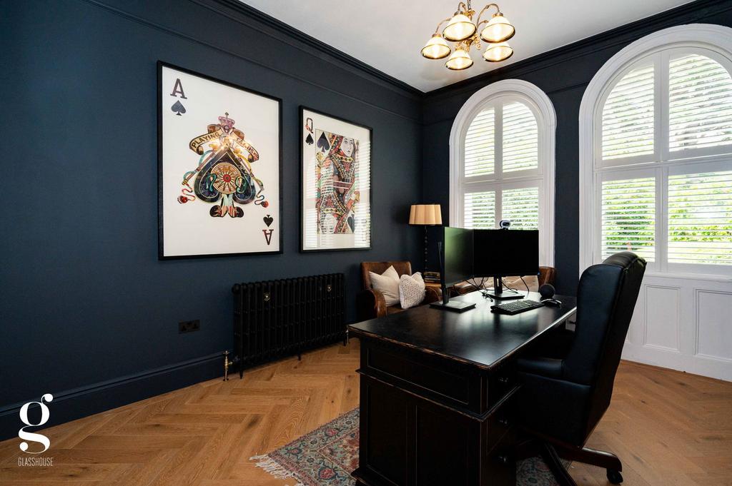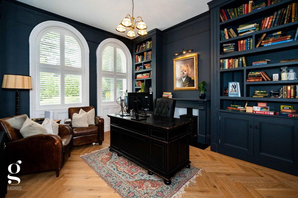 Study: A beautifully decorated workspace, overlooking the driveway. The inclusion of Corston solid brass and bronze sockets elevates the detail, while proportions allow for a library or professional office setup. Two tall arch windows are stylishly finished with new plantation shutters, while a working woodburning stove sits within the fireplace between two full height bookshelves, the right of which is actually a large secret door; concealing a useful shelved storage room behind.