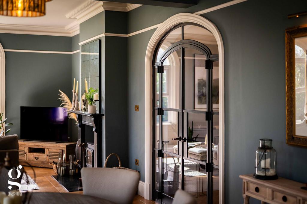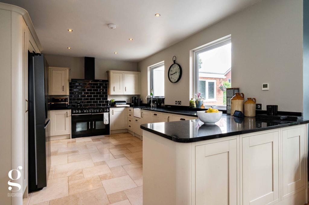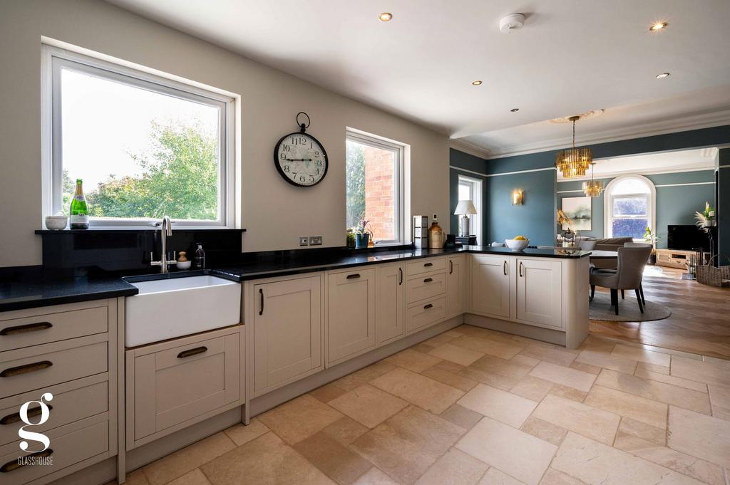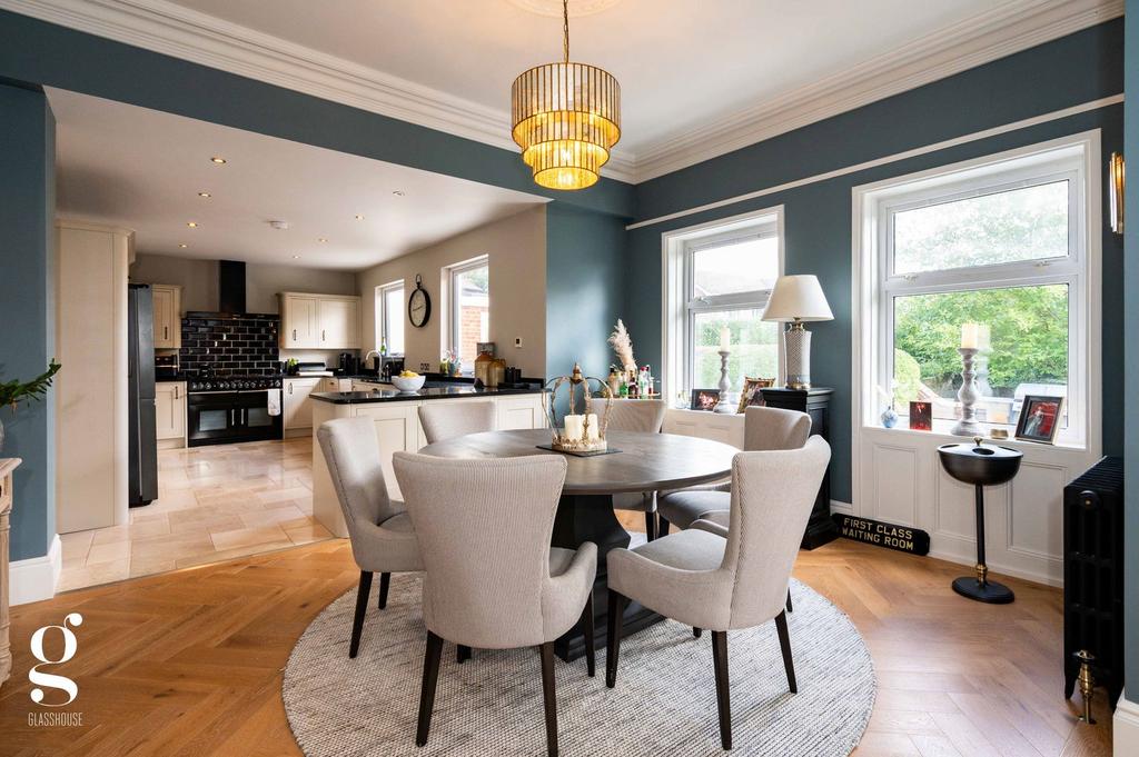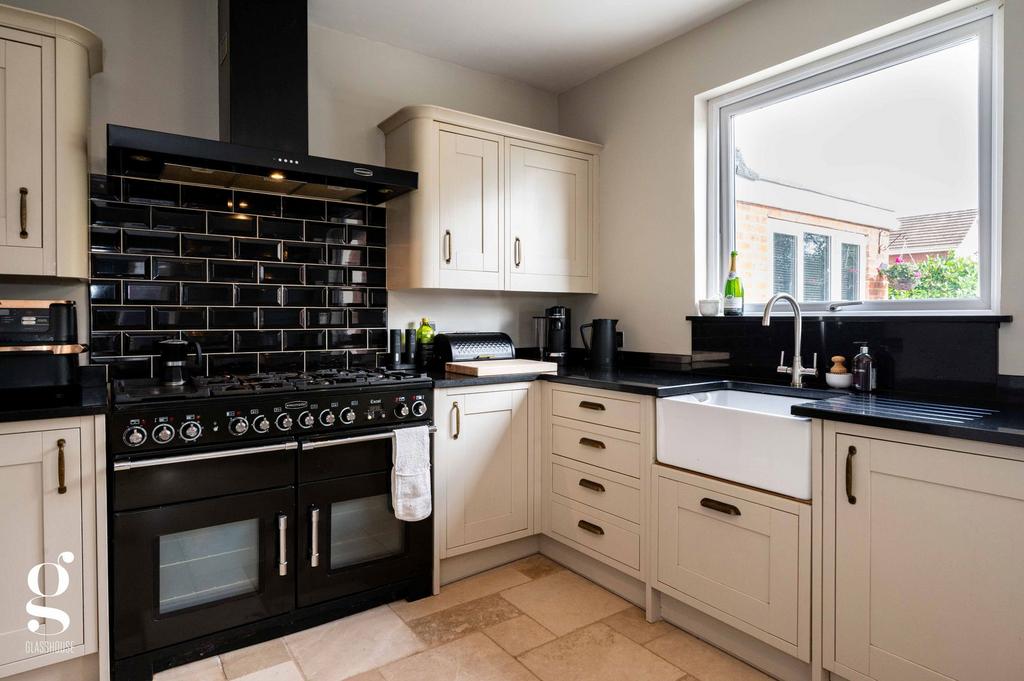 Open Plan Kitchen/Dining/Sitting Room: The central hub of the home, reconfigured by knocking through the wall between the lounge and dining room, now forms a generous and versatile open plan space. A newly created archway, modelled on the original, enhances the symmetry and flow, while bespoke Crittall style steel & glass doors add architectural splendour. The kitchen includes a Rangemaster stove with matching extractor & black subway splashback tiles, dishwasher, space for an American style fridge/freezer, and extensive cupboard storage with granite countertops. A practical U-shaped arrangement of units is set beneath two wide windows overlooking the garden, fitted with a Belfast sink and drainer.