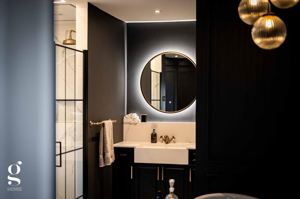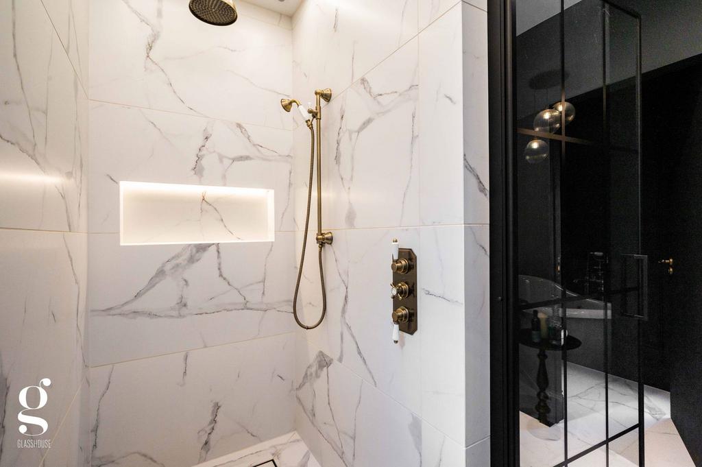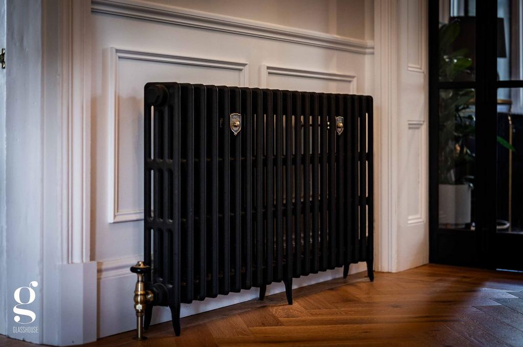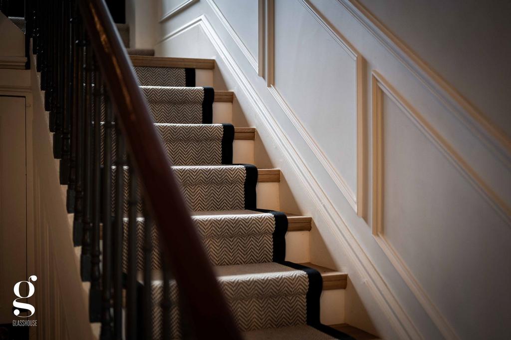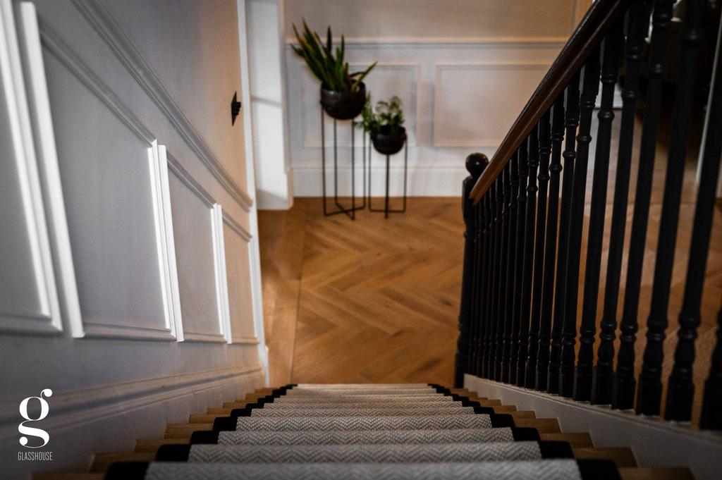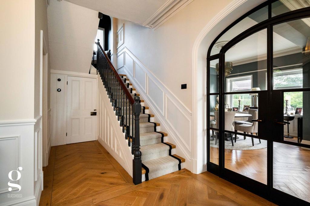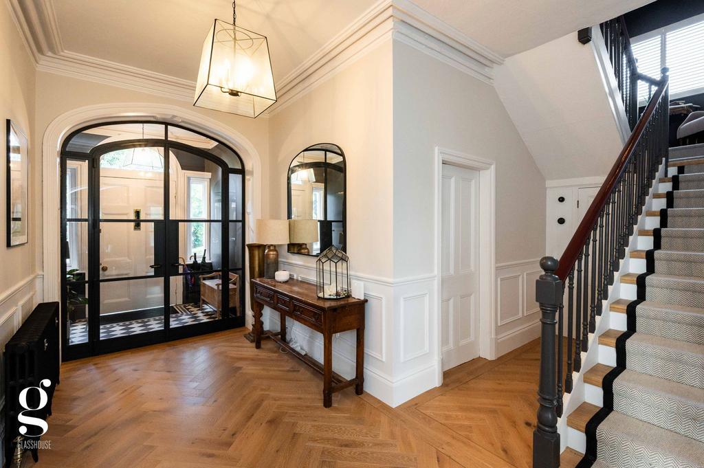Lobby & Entrance Hall: A striking entrance, freshly re-skimmed and redecorated, with bespoke wall panelling and solid oak herringbone flooring laid with brass trim insets. Hand-carved skirting and architraves reinforce the heritage detailing, while a bespoke stair runner sets an elegant first impression. The initial lobby space is separated from the entrance hall via the first of two stunning bespoke archways with Crittall-style glazing, laid in new floor tiles.