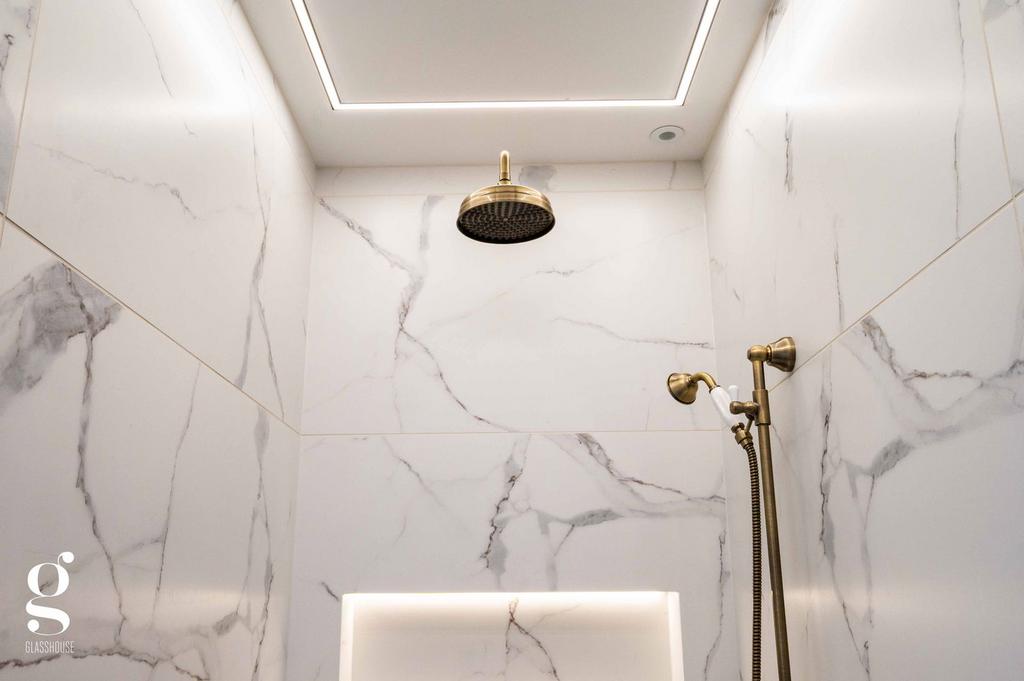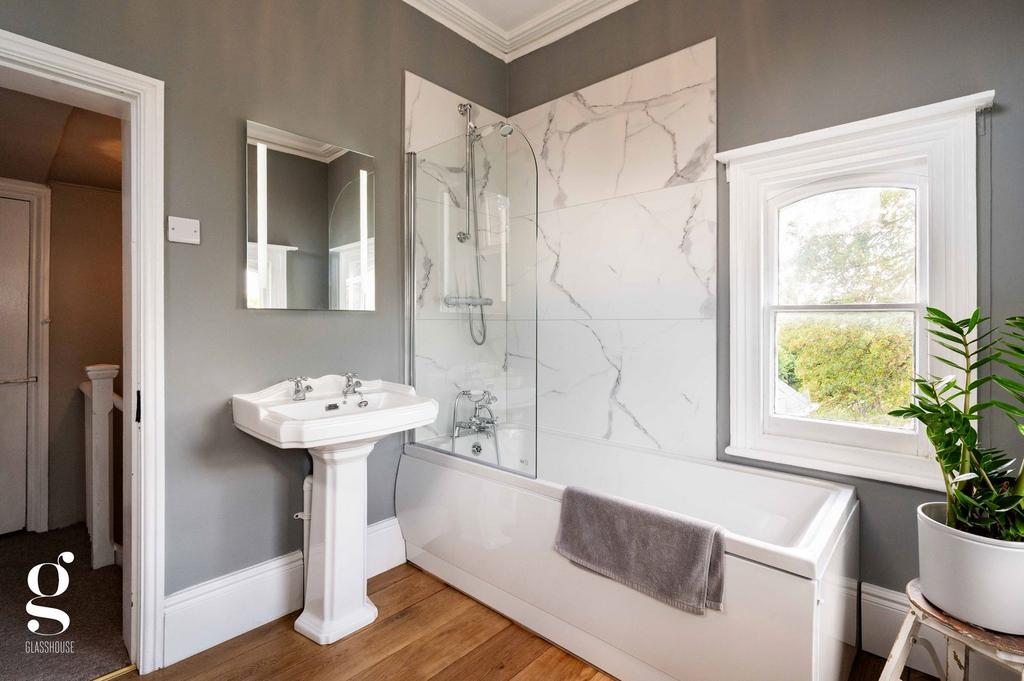 Family Bathroom: Reconfigured into the tower space. A completely new installation, with traditional style pedestal basin, WC, LED mirror and bath with overhead shower, surrounded by marble-effect tiling. Finished in soft grey tones with oak flooring, echoing the home’s period elegance. A door opposite the bathroom on the second floor landing accesses the attic (with treated timbers), which provides copious storage space.