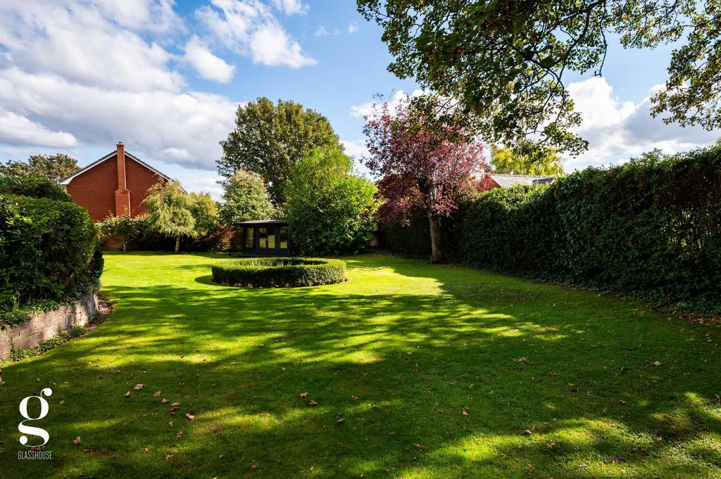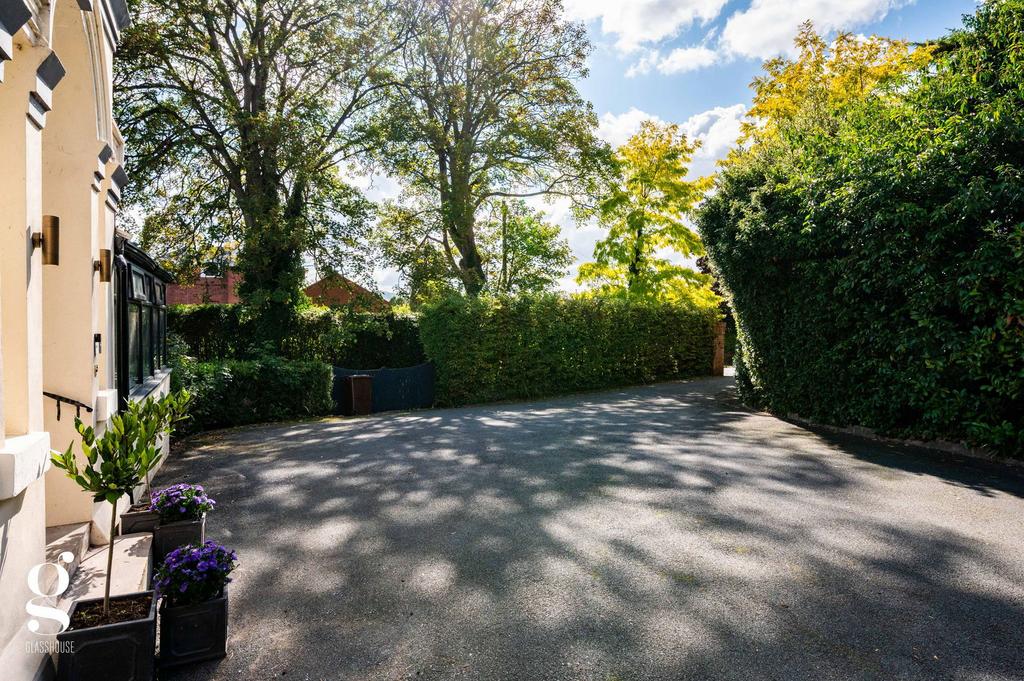 The property sits within nearly half an acre of wrap-around gardens, enclosed by mature hedging and trees for privacy. Lawns stretch around the house, intersected by shaped hedging and specimen trees, with a contemporary summerhouse nestled to the rear. Directly outside the kitchen at the rear lies a broad stone terrace, finished with tiles and block paving. This area includes space for an outdoor kitchen, dining and multiple seating zones, all perfectly oriented for afternoon sun.