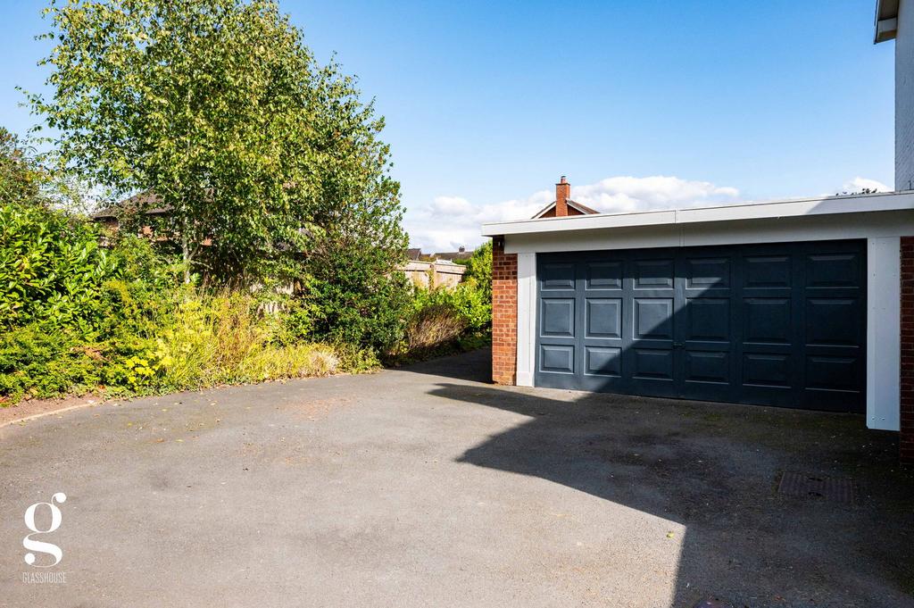 Beyond, the lawn offers space for play, planting or landscaping. The whole garden is designed for both privacy and grandeur, with a circular box hedge adding a central feature to the lawn. At the front, a sweeping driveway provides ample parking for multiple vehicles and access to the detached double garage with additional store room behind, ideal for storage, workshop or hobby use.