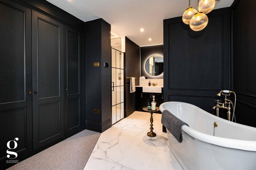 Principal Bedroom Suite: The ultimate retreat – a large master bedroom with new fitted carpets. Walls have been removed to create a large private dressing room & ensuite bathroom, now fitted with bespoke joinery and finished to an exceptionally high standard. A roll-top bath, walk-in shower and marble-effect tiling complete the look, while new carpets and ceiling detailing ensure warmth and elegance.