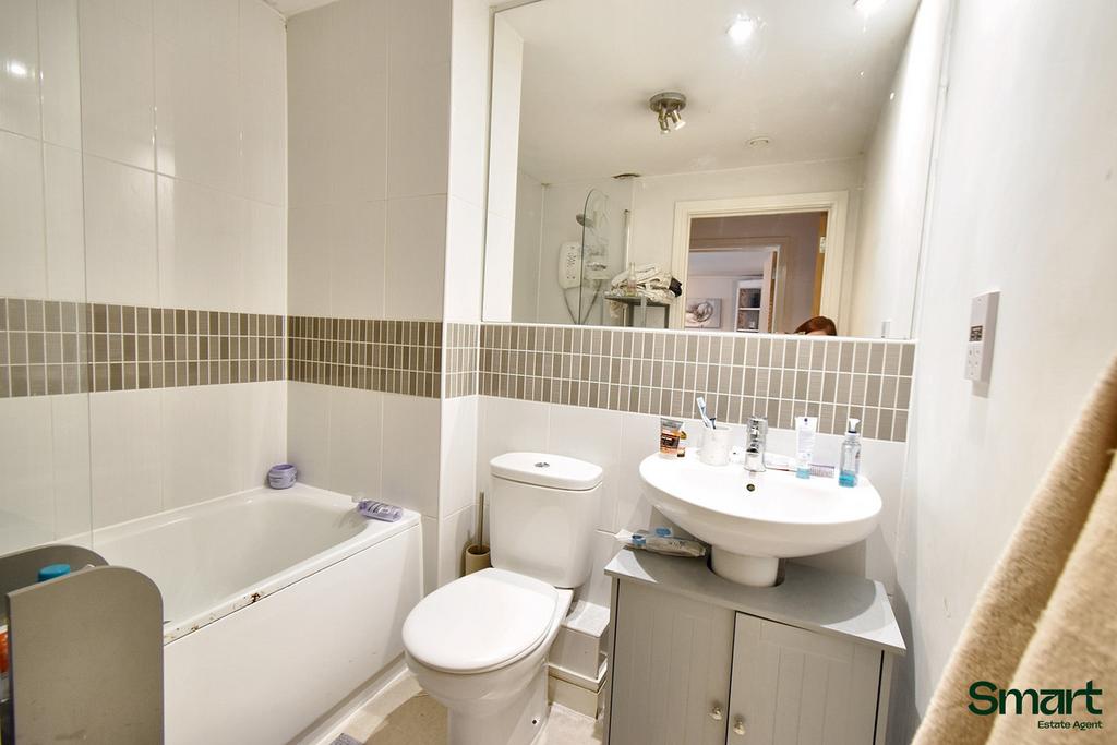 The bathroom features a clean, white suite consisting of a low-level WC, pedestal hand wash basin, and a bath with shower over and a glass screen. A shaver point and extractor fan are also included.