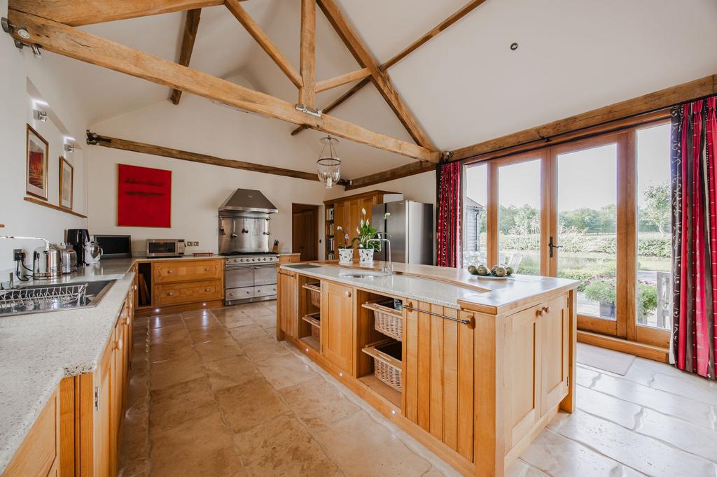 The main barn boasts almost 3,500 sq ft in a horseshoe shape, making for a brilliantly versatile layout with numerous wings around a central courtyard. The kitchen/dining room serves as a stunning anchor point between both wings, carefully designed to weave a modern and sociable way of living into the home, without for a moment compromising on the character and drama of the original structure. The sitting room brings excellent balance to the open plan reception and showcases extraordinary volume courtesy of the double height vaulted ceiling and exposed original timbers. Not to mention the window perfectly framing the field views beyond; an ever changing work of art!