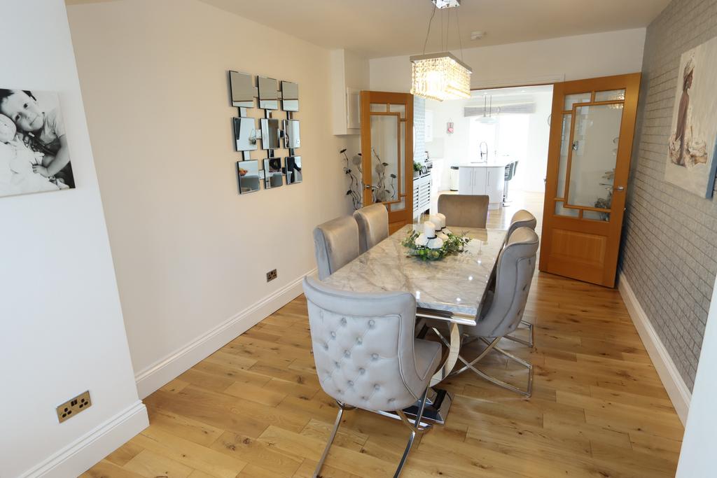 DINING ROOM: at front, 18’ 10” x 9’ 8” (5.74m x 2.95m), radiator, oak flooring, uPVC double glazed window with plantation shutters, 4 concealed down lighters, and glazed double opening doors leading to kitchen.