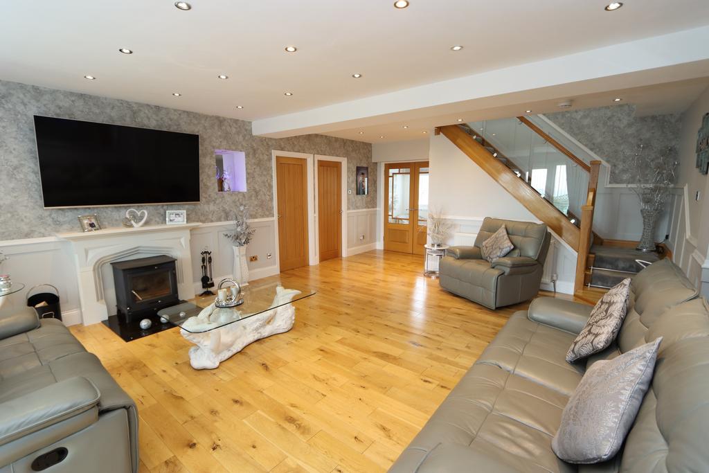 LIVING ROOM: 22’ 3” x 16’ 4” (6.78m x 4.98m), 2 radiators, oak flooring, concealed downlighters, feature fireplace incorporating log burner, part panelled walls, uPVC double glazed double opening doors with vertical louvred blinds leading to the rear garden with sea views beyond, 2 illuminated display alcoves, understairs store cupboard and feature oak & glass staircase to first floor.