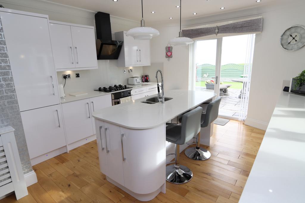 DINING KITCHEN: 22’ 6” x 12’ 9” (6.86m x 3.89m), a good range of white hi-gloss fitted wall & floor units, kick space LED lights, granite illuminated work surfaces, fitted breakfast bar with granite benchtop & upstands, kitchen island with granite worksurface incorporating 1½ bowl inset sink & mixer spray tap, 5 ring gas hob with illuminated extractor hood above, under bench oven, integrated dishwasher, integrated fridge/freezer, 24 concealed down lighters, oak flooring, radiator, uPVC double glazed window and uPVC double glazed double opening doors leading to and overlooking the rear garden with sea views beyond.