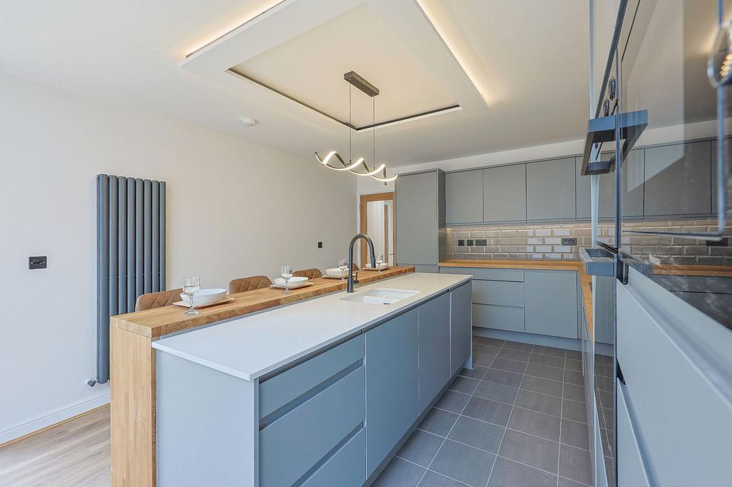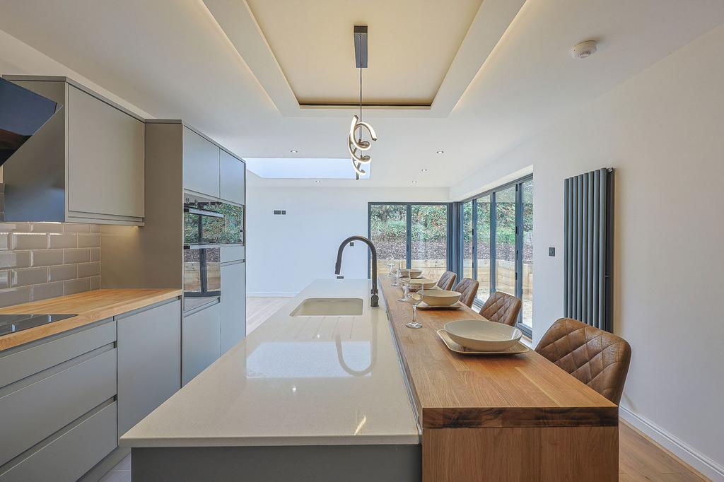 The accommodation comprises: through reception hall with composite door entrance and 'sky light'. The generous front lounge enjoys the spectacular views and electric fire. The stunning 'open plan' living dining kitchen features 'twin' bi folding doors to the rear garden. The bespoke and stylish 'grey' kitchen includes solid wood work tops, integrated induction hob, cooker hood, oven, microwave, fridge/ freezer and dishwasher. The 'island' unit includes a 'quartz' work top with solid surface sink, and an adjoining solid wood breakfast bar with feature lighting above, fitted utility/ laundry room with appliance space, THREE BEDROOMS, all of which are considered ‘doubles’, the main bedroom includes a LUXURY ENSUITE SHOWER ROOM, with electric ‘rainfall’ shower and the main luxury bathroom features a ‘rainfall shower’ and ‘sky light’.