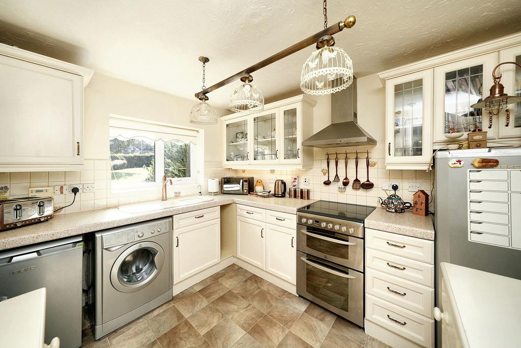 Fitted with a range of wall and base units with roll-top work surfaces, one-and-a-half drainer sink unit, and integrated wall-mounted boiler. Benefitting from a double-glazed window overlooking the rear garden, door leading into the lounge, and freestanding appliances including cooker, washer, and fridge-freezer.