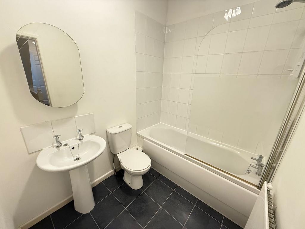 Part tiled, three piece suite incorporating bath, pedestal wash hand basin and low flush wc, Bristan electric shower over bath, glazed shower screen, single radiator, tiled flooring and extractor fan.