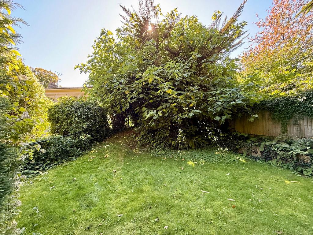 Private secluded garden accessed via a footpath at the side of garage with 2 steps.