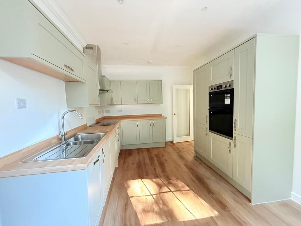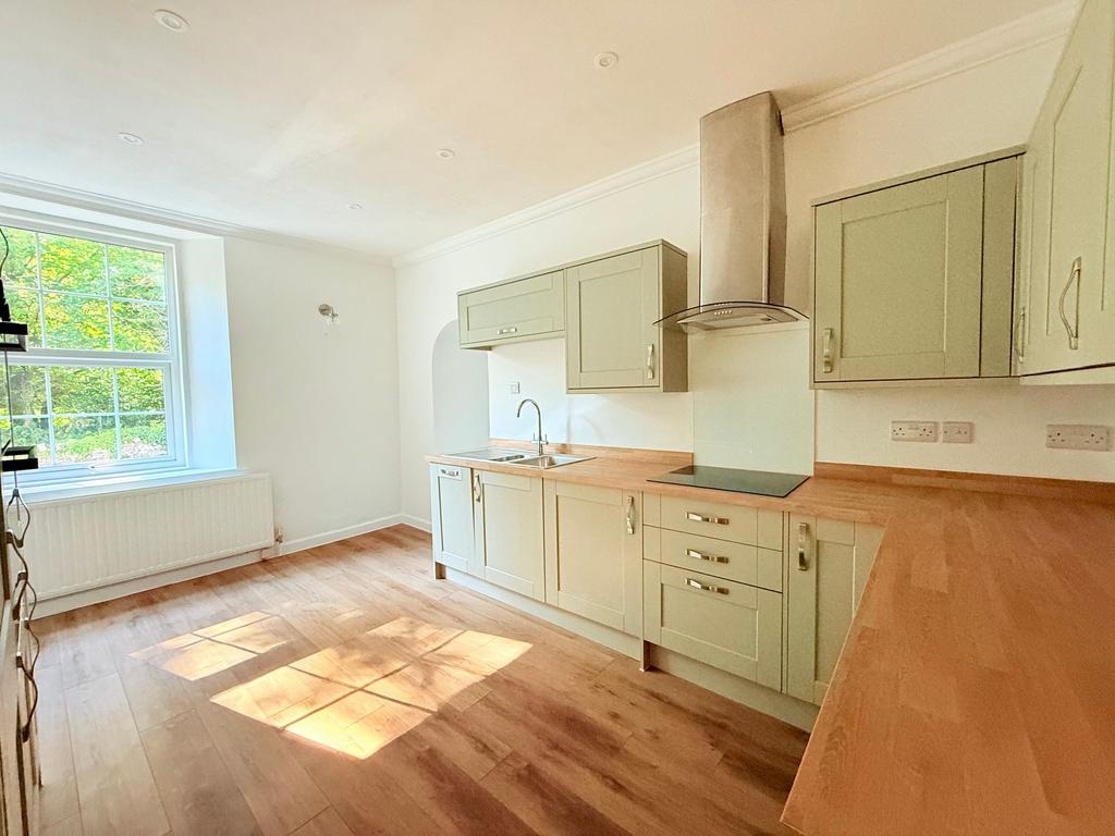 From the car park a footbridge leads to a private front door with one small step opens into the bright RECEPTION HALL with two windows, loft access hatch, large storage cupboard and further small cupboard housing the electric meter and consumer unit. SITTING ROOM with large bay window enjoying woodland views. One step rises to the KITCHEN which has been recently fitted with a range of sage green shaker style units and wood effect work tops with inset sink. Built-in electric double oven and grill, ceramic hob with extractor above, integrated, washing machine, dishwasher and fridge/freezer. Wood effect flooring and window with woodland views.