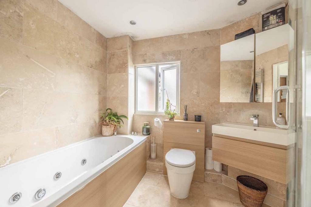Upstairs, the principal bedroom is a generous double with front-aspect views, a private dressing room, and a luxurious en-suite featuring a whirlpool bath and separate shower. Bedrooms two, three, and four are also generous doubles, served by a well-proportioned family bathroom with a bathtub and integrated shower.