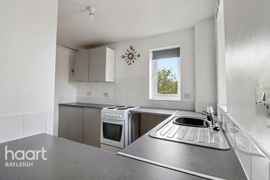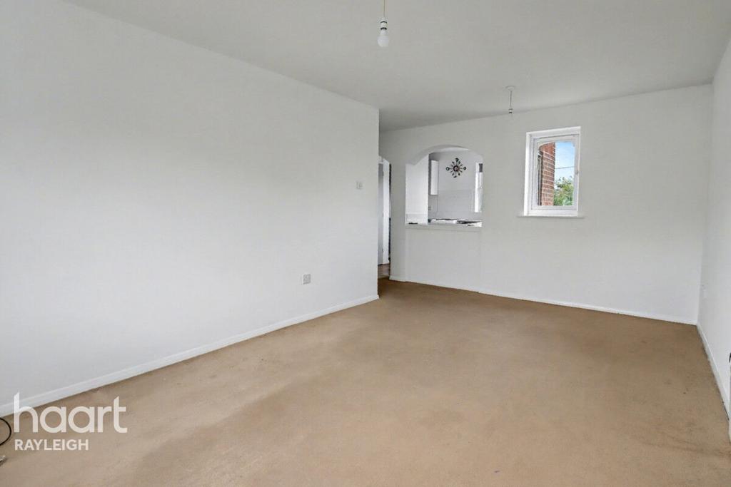 Range of wall and base units with work surface above incorporating stainless steel sink and drainer, space for cooker, space for washing machine, part tiled walls, breakfast bar with serving arch overlooking the lounge, double glazed windows to rear and side, extractor fan.