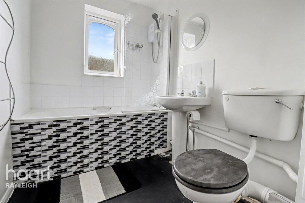 Three piece suite comprising panelled bath with electric shower over, pedestal wash hand basin and low level w.c, part tiled walls, double glazed obscure window to rear.