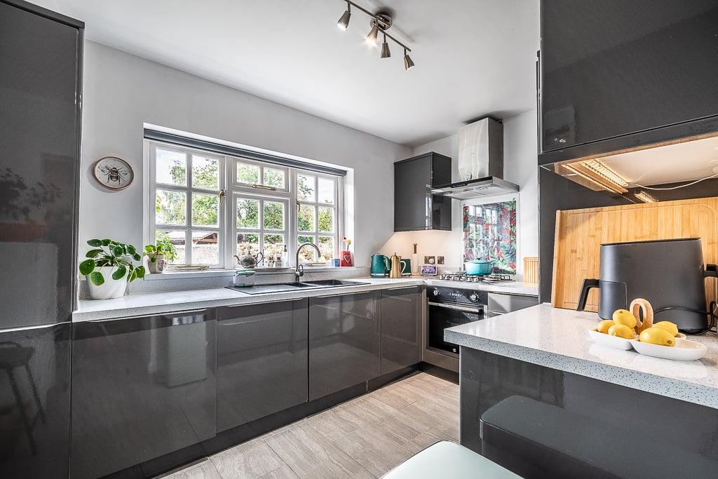 Large window overlooking the side garden, worktop surface with composite sink and drainer with mixer tap, range of cupboards and drawers under, 5 ring gas hob with electric oven under and stainless steel extractor over, matching range of eye level cupboards, integrated fridge/freezer, integrated dishwasher, integrated washer/dryer, large corner larder style cupboard, tiled floor.