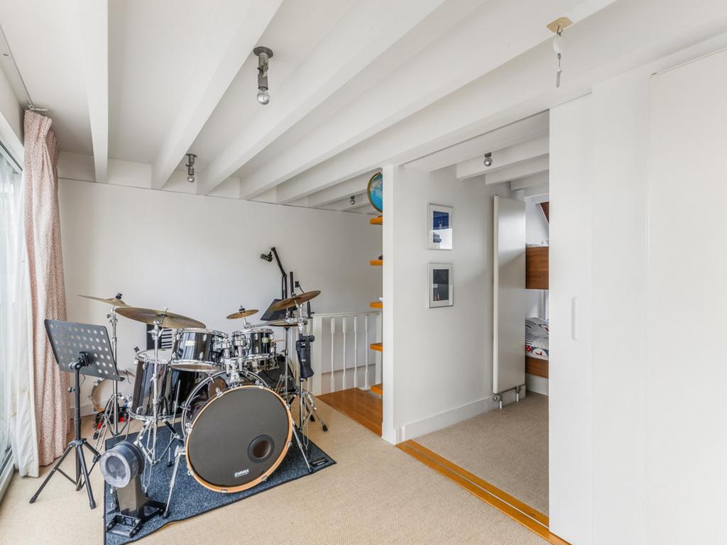 A handmade bespoke kitchen with sleek Corian worktops, Gaggenau appliances, and limestone flooring flows into a striking seating area with double-height Crittall windows, flooding the space with natural light. To the front, a formal dining area with a gas fireplace creates the perfect setting for entertaining. A contemporary glass balustrade with wood panelling leads down to a relaxed living space with a study area opening directly to the garden. This floor also includes two double bedrooms and a stylish bathroom. The main living room showcases solid oak flooring, a working fireplace, original shutters, bespoke floor-to-ceiling shelving, and a statement Moooi light fitting. Bedrooms & Bathrooms: The principal suite occupies the second floor, complete with a bespoke dressing area and luxurious ensuite bathroom featuring Samuel Heath XO fittings. The top floor offers a further bedroom and flexible music/study space, opening onto a private terrace with rooftop views, alongside an additional family bathroom.