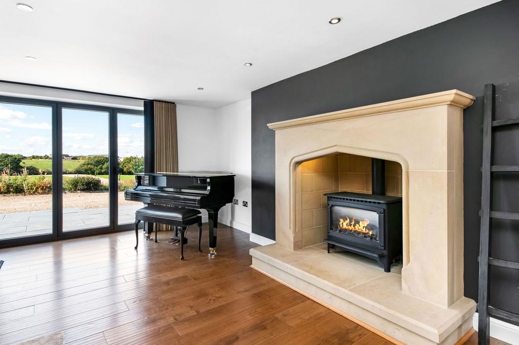 As the floor layout plan and photographs suggest, the home is blessed with a fabulous sitting room. It has three windows to the rear and two sets of bi-folding doors to the front giving stunning views out over the property’s terrace, driveway, lawned gardens and paddock beyond. There is a magnificent stone fireplace with raised hearth, this being home for a gas coal burning effect fire which is a fabulous feature to the room. There is attractive flooring, period style central heating radiators inset spotlighting to the ceiling and there are provisions for a wall mounted TV. A broad opening leads through to the second sitting room/games room.