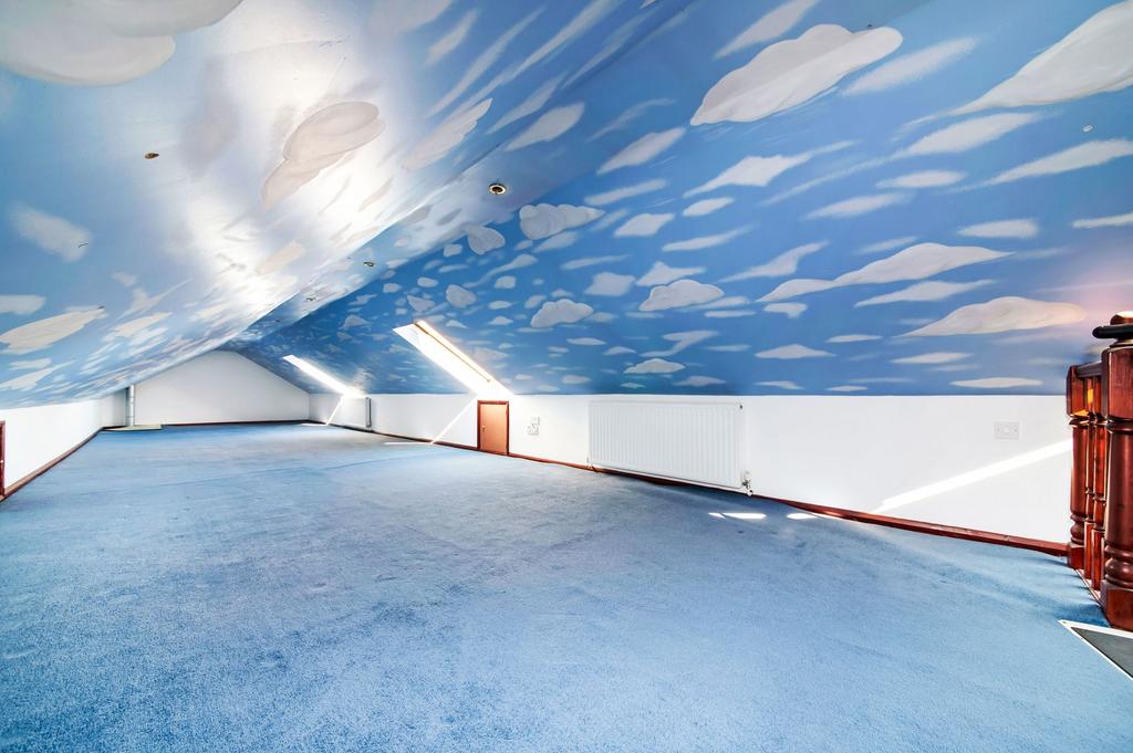 From the first floor landing, a doorway gives access to the playroom, accessed courtesy of a spiral staircase. The playroom has a fabulous ceiling being decorated with clouds. It has had many uses for the family and has under eaves storage, a number of radiators, three large Velux windows and inset spotlighting to the ceiling.